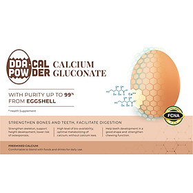 Thực phẩm chức năng canxi hữu cơ DDA chiết xuất từ vỏ trứng gà tinh khiết 99.9% dạng bột hoà tan nhanh, hỗ trợ giúp hệ xương chắc khoẻ, giảm loãng xương, còi xương, tăng chiều