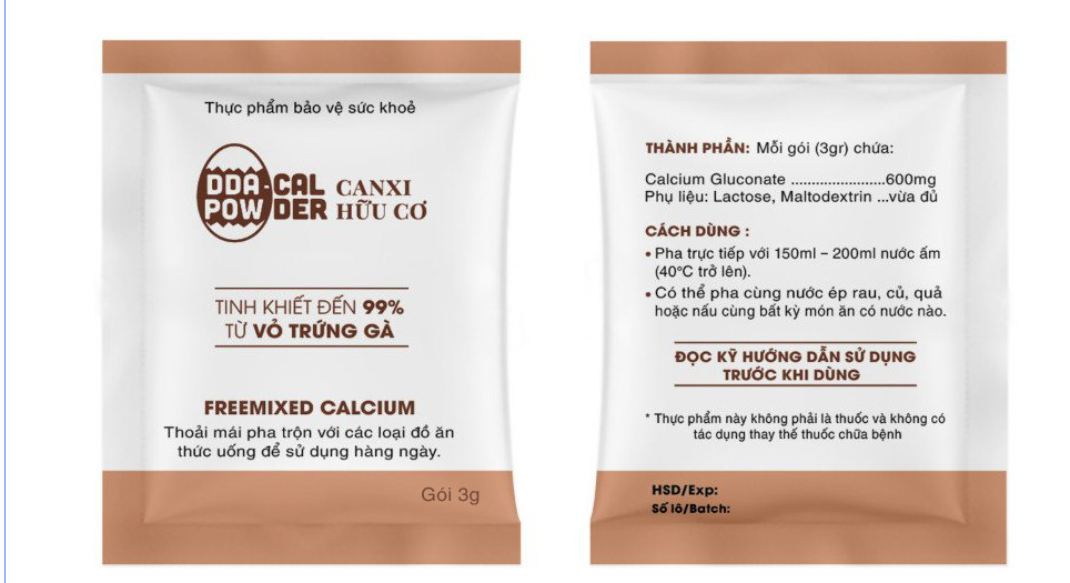 Thực phẩm chức năng canxi hữu cơ DDA chiết xuất từ vỏ trứng gà tinh khiết 99.9% dạng bột hoà tan nhanh, hỗ trợ giúp hệ xương chắc khoẻ, hỗ trợ ngăn ngừa loãng xương, còi xương, tăng chiều cao và các bệnh lý thiếu canxi, hỗ trợ mọc răng sớm, cho răng chắc & đều đẹp, tăng cường chức năng ăn nhai. Với nguồn canxi hữu cơ gốc gluconate thân thiện với hệ tiêu hoá, hấp thu tối đa lượng canxi, sản phẩm bảo vệ và hỗ trợ tối ưu cho quá trình tăng trưởng thể chất của bé và gia đình. Sản phẩm thích hợp cho bé từ 1 tuổi trở lên đến người lớn tuổi.