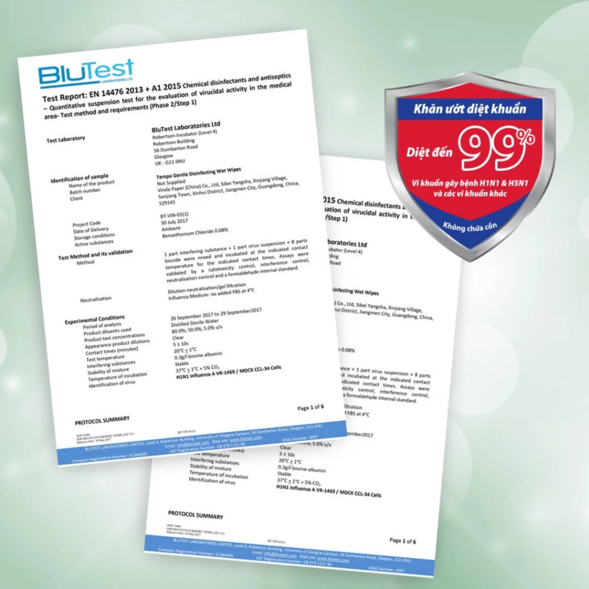 • Diệt 99% vi khuẩn gây H5N1, H1N1