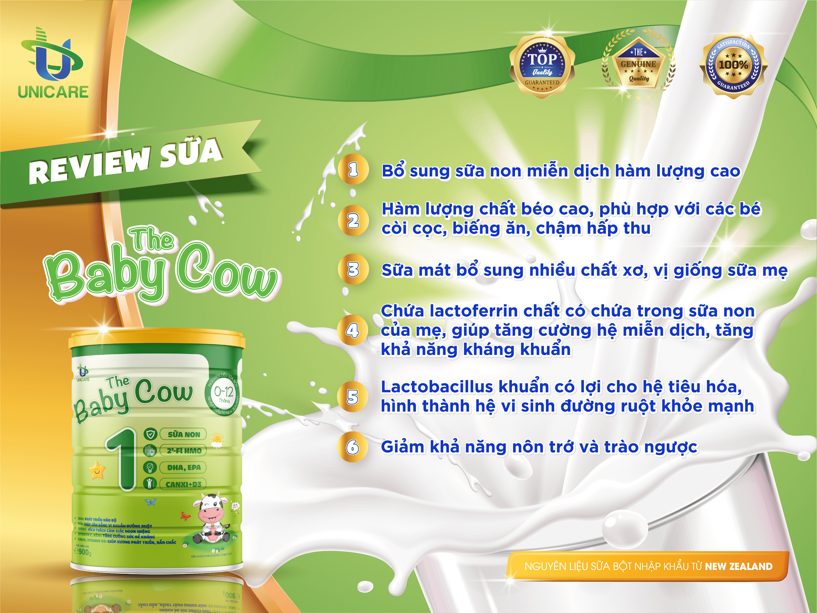 Sữa Non The Baby Cow 1 - đảm bảo tiêu chuẩn lựa chọn dinh dưỡng từ sữa bổ sung Tiêu chí đầu tiên thường được phụ huynh lựa chọn là yếu tố mang đến "nguồn dinh dưỡng tốt lành cho trẻ" và "niềm an tâm cho cha mẹ". The Baby Cow 1 một sản phẩm từ Công ty cổ phần dinh dưỡng quốc tế Unifoods. Sản phẩm được FDA - Cục quản lý Thực phẩm và dược phẩm Hoa Kỳ chứng nhận đủ điều kiện an toàn. Trong Sữa non The Baby Cow có chứa chất gì? Lúc đầu mua về thì cũng thầm nghĩ, thành phần chắc chắn là chứa sữa non rồi, nhưng điều làm mình bất ngờ đó là hàm lượng cực cao luôn, lên đến 1.000.000 mcg - lọt top những sữa non có chứa kháng thể cao nhất, vô cùng yên tâm về tác dụng tăng đề kháng luôn. Sau đó khi nghiên cứu kỹ bảng thành phần, mình thấy càng ưng ý hơn khi sữa chứa các chất như: ● Kháng thể lactoferrin: Một loại kháng thể kỳ diệu có trong sữa mẹ, nhưng chỉ duy trì đến hết 9 tháng đầu đời nếu trẻ bú mẹ hoàn toàn. Kháng thể này tạo hàng rào bảo vệ tự nhiên, giảm mắc các bệnh về đường hô hấp ● Dinh dưỡng 2Fl'HMO: Thành phần dinh dưỡng đứng thứ 3 trong sữa mẹ, tỷ lệ chất này trong The Baby Cow ngang ngửa sữa mẹ bình thường chứ không đơn thuần là sữa công thức nữa. Không chỉ cung cấp năng lượng, HMO còn tăng mức hấp thu dinh dưỡng tại ruột và tăng đề kháng cho con. ● Chất xơ GOS/FOS tỷ lệ vàng 9:1: Chất xơ hòa tan cải thiện tốt các vấn đề tiêu hóa của con như táo bón, đầy bụng, ăn không tiêu. Tỷ lệ 9:1 đã được tính toán để phù hợp, đảm bảo cải thiện việc ăn uống. ● Chiết xuất EPA - DHA từ tảo biển: Có nguồn gốc từ tự nhiên nên cực kỳ an toàn với trẻ nhỏ, giúp mắt sáng và trí não thêm thông minh. ● Bộ ba Canxi - Vitamin D3 - MK7: Đây được ví như những chất kết nối xây lên hệ xương vững chắc và phát triển chiều cao cho con. Nếu thiếu đi vitamin D3 và MK7 thì cơ thể gần như không thể hấp thụ Canxi Công dụng nổi trội của sữa non The Baby Cow: -Chắc hẳn nghiên cứu xong những thành phần phía trên, các mẹ cũng đoán được những tác dụng nổi trội của sữa The Baby Cow rồi đúng không? Để mình liệt kê lại cho mẹ tiện theo dõi nhé: ● Cung cấp năng lượng phù hợp với lứa tuổi trẻ dưới 1 tuổi, đặc biệt phù hợp thay thế sữa mẹ ở những mẹ ít sữa ● Củng cố thêm hệ miễn dịch đầu đời vốn dĩ rất mong manh ở trẻ, giảm đi nguy cơ mắc các bệnh nguy hiểm ● Giải quyết các vấn đề đường ruột hay gặp như táo bón, đầy hơi, nôn trớ… ● Cho cơ thể bé khỏe mạnh từ bên trong từ trí não đến vận động, tăng trưởng cả cân nặng lẫn chiều cao Nhất là các bé đang trong tình trạng lười ăn, ăn hoài không tăng cân, thấp bé nhẹ cân… thì mẹ cho bé sử dụng càng sớm càng tốt nha.