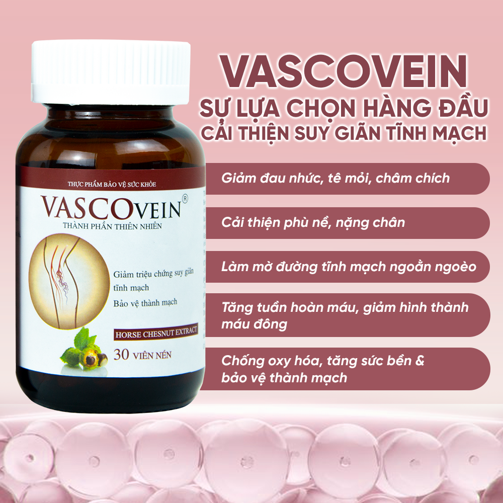 VIÊN UỐNG HỖ TRỢ ĐIỀU TRỊ VÀ PHÒNG NGỪA SUY GIÃN TĨNH MẠCH 1. Mô tả sản phẩm: - Hộp thủy tinh 30 viên. 2. Công dụng chính của Viên uống Vascovein: - Làm