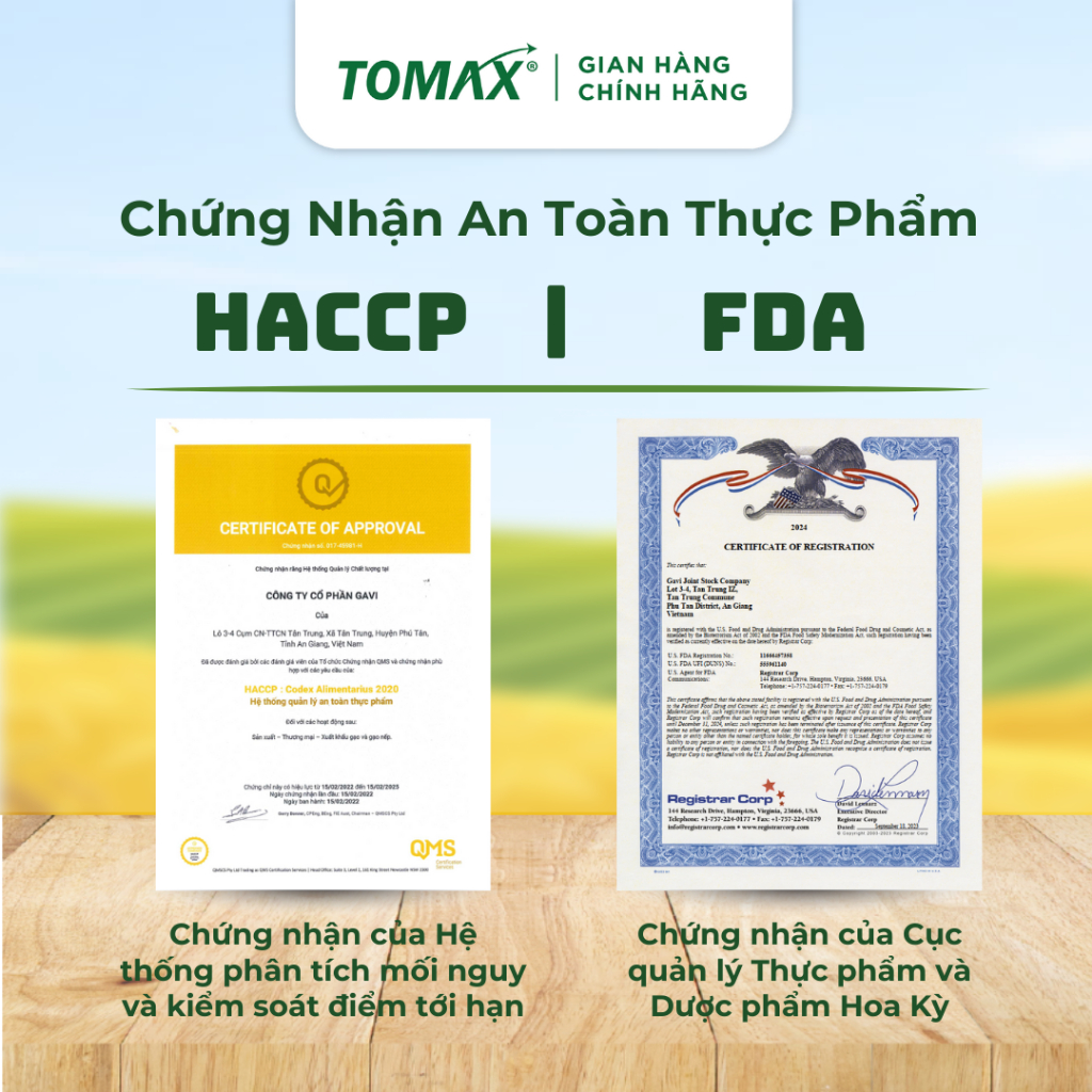 Gạo hữu cơ Tomax 100% không có chất bảo quản, không có chất chống mọt, chống nấm, chất tẩy trắng an toàn tuyệt đối cho người sử dụng. Giá trị dinh dưỡng trong mỗi hạt