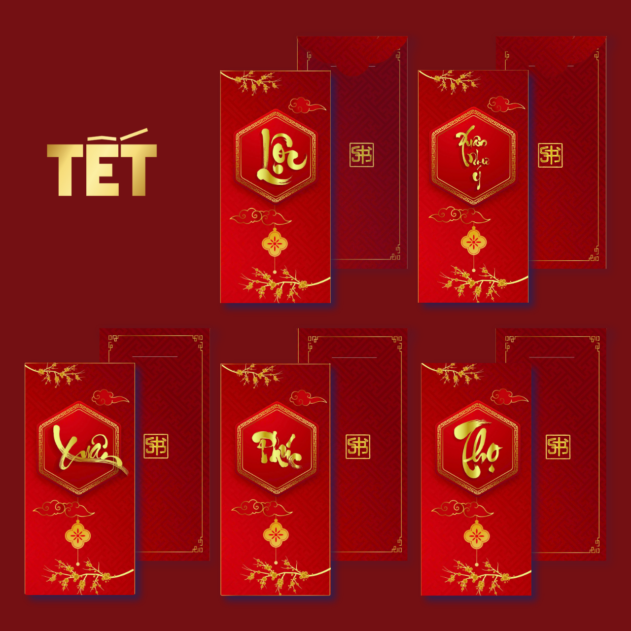 ✨Combo 5 Cái Bao Lì Xì Thiết Kế Chữ Xuân, Lộc, Thọ, Phúc, Xuân Như Ý - Tết 2025 Giấy Cứng C150 Siêu Dày Dặn - SBOOKS