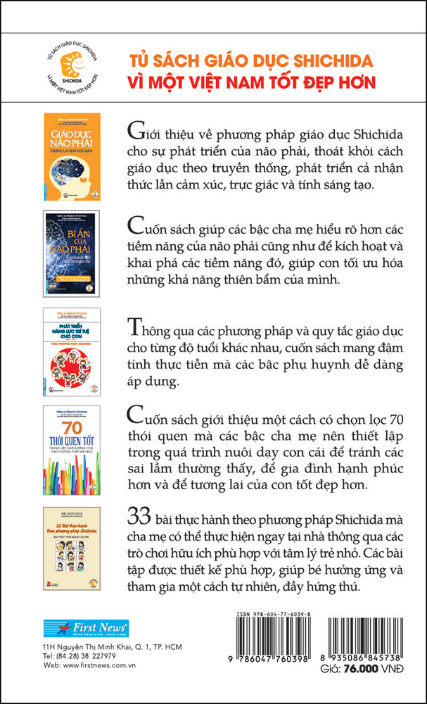 Tiềm thức con người hoạt động tối ưu khi vừa chào đời. Vì vậy, phụ huynh cần đặc biệt lưu tâm đến thói quen giáo dục con trong giai đoạn này để đạt được kết quả tích cực. 70 Thói Quen Tốt Trong Việc Nuôi Dưỡng Con Theo Phương Pháp Shichida mang đến 70 thói quen tích cực trong việc nuôi dưỡng năng lực trí não cho trẻ mà Giáo sư Shichida đã chắt lọc sau thời gian dài nghiên cứu. Cha mẹ áp dụng những thói quen này vào việc giáo dục trẻ ngay từ những năm tháng đầu đời sẽ giúp tạo ra các liên kết tuyệt vời trong não của trẻ, nhờ đó trẻ sẽ phát triển tốt năng lực tư duy.