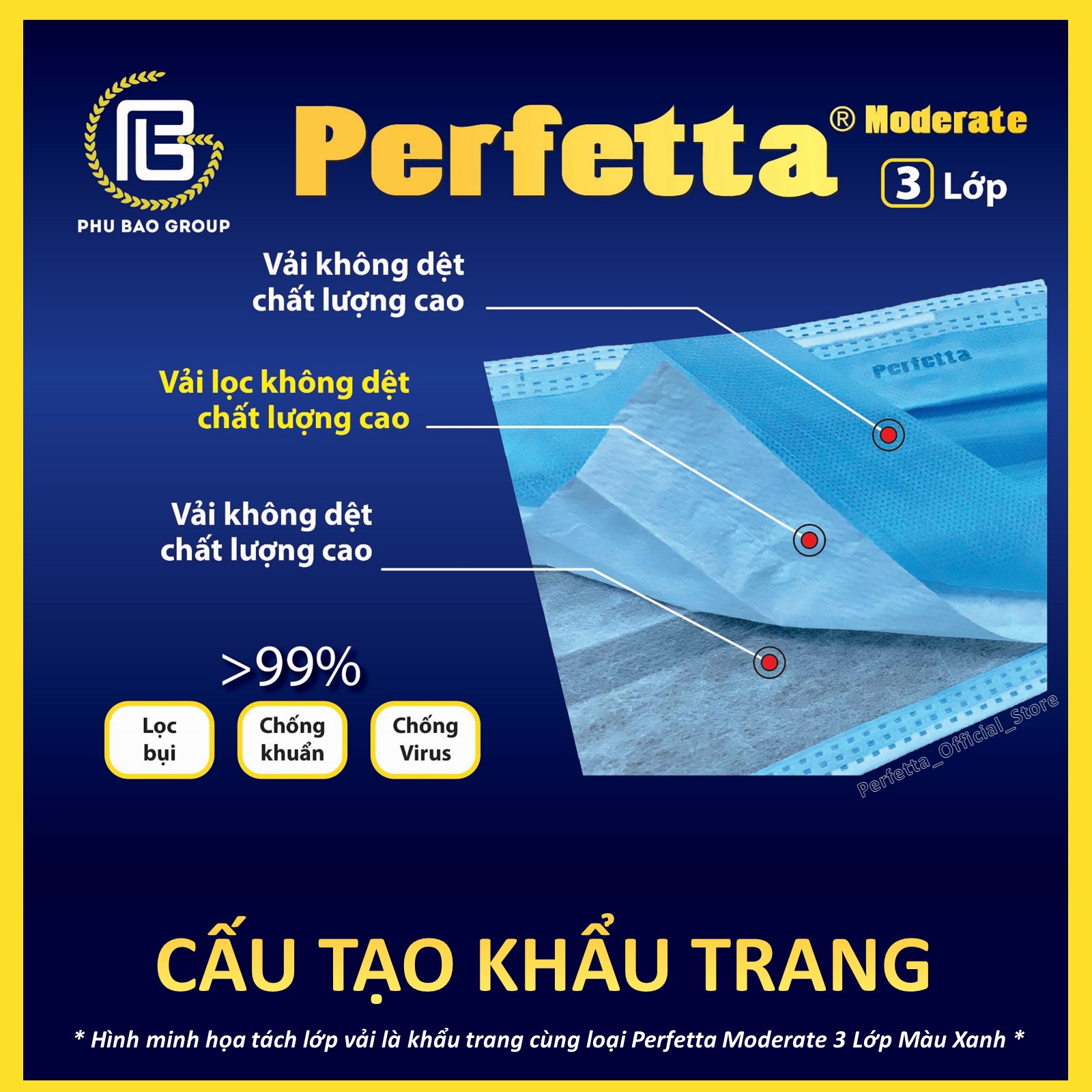 Khẩu trang y tế 3 lớp Perfetta Moderate Trắng, 50 cái, sản phẩm có đặc tính kháng khuẩn cao, mềm mượt và an toàn cho sức khoẻ của mọi thành viên trong gia đình. Đặc