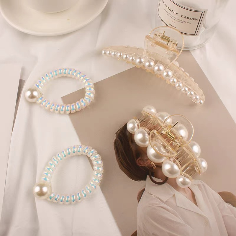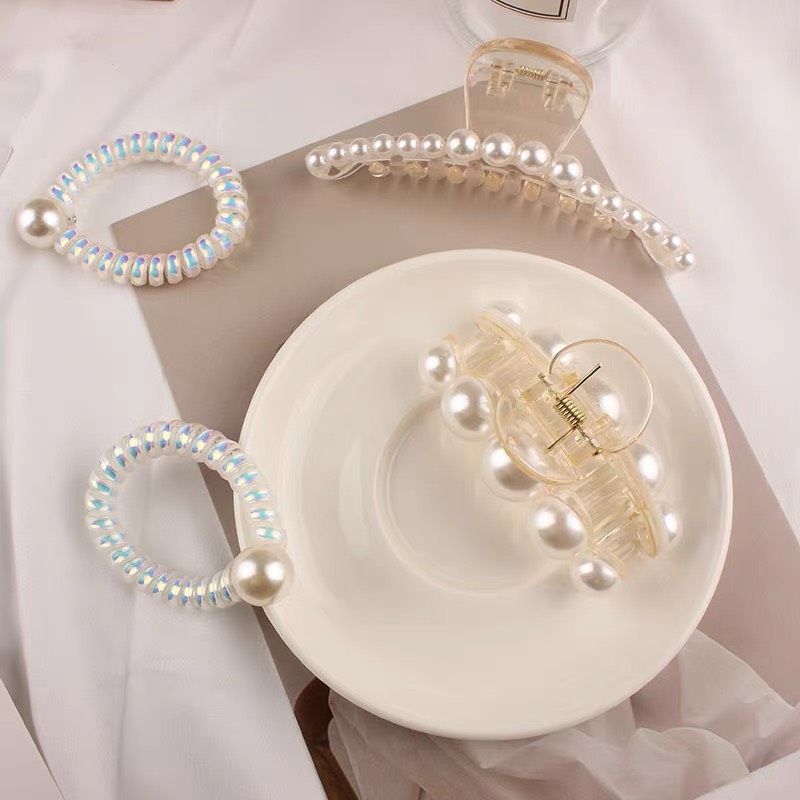 Bộ 5 món kẹp tóc đính ngọc trai, cột tóc Hàn Quốc phong cách trẻ trung xinh xắn KT28 Kẹp càng cua, dây buộc tóc đính ngọc trai là món phụ kiện tóc rất được