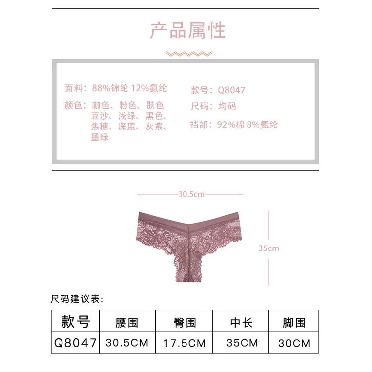 Không đường may lộ liễu: Công nghệ dập viền laser hiện đại, giảm hằn vết, không gây khó chịu khi vận động. Thông số kỹ thuật Mục Thông tin Mã sản phẩm Q8047 Chất liệu Ren cao cấp + vải lưng bóng co giãn Size F (40–50 kg) Màu sắc Hồng pastel, Kem, Tím, Xanh, Nâu Kiểu dáng Lọt khe (string), cạp thấp Phong cách Gợi cảm – Quyến rũ Lợi ích sử dụng