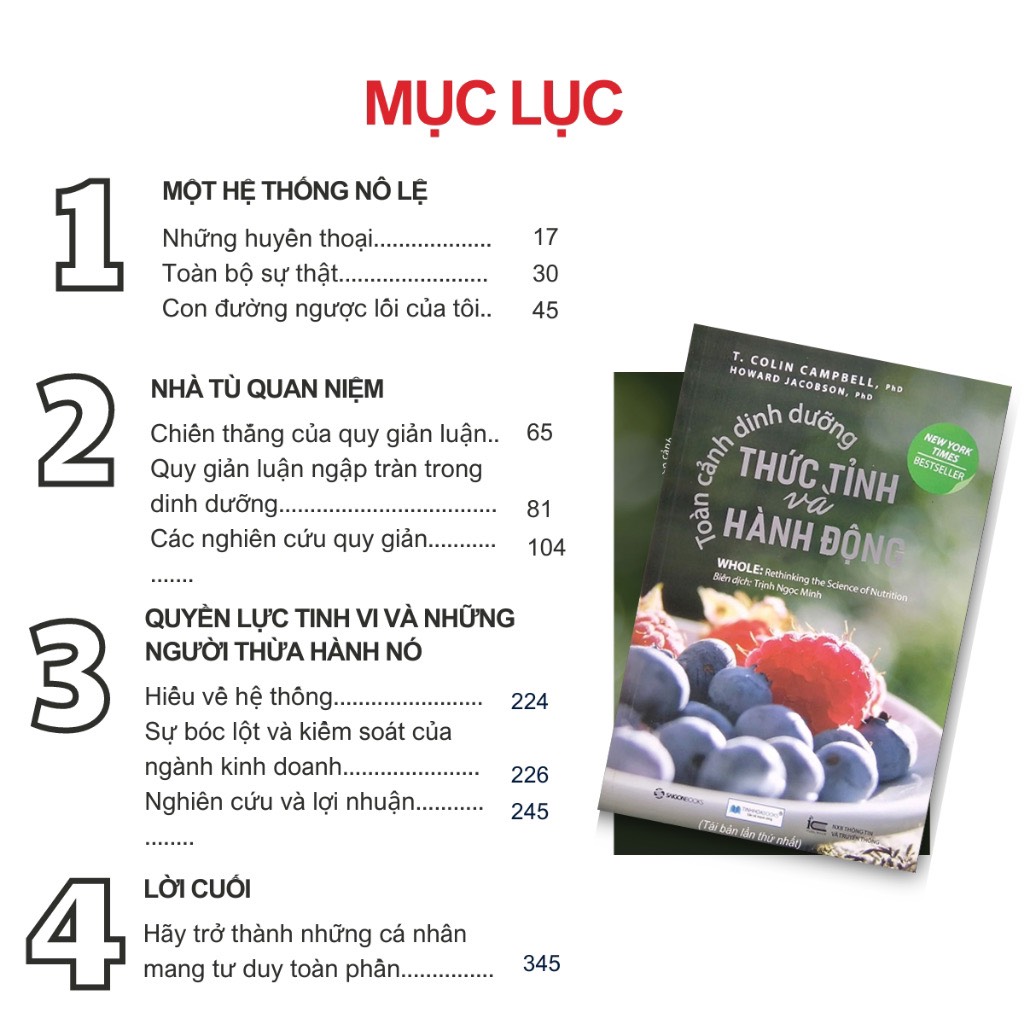 • Nội dung: Theo thống kê mới nhất năm 2018 của Tổ chức Y tế thế giới WHO. Hiện nay, ở Việt Nam mỗi năm có 115.000 người chết vì ung thư, 200.000 người chết vì bệnh tim mạch. 3.5 triệu người bị bệnh tiểu đường. Điều đáng nói, số ca mắc bệnh mới gia tăng không ngừng và độ tuổi bị bệnh ngày càng trẻ hơn. Nếu bạn muốn sống một cuộc đời không phải ưu lo về ung thư, bệnh tim, tiểu đường, thì tất cả những gì cần làm đều đã nằm trong tay bạn: “Toàn cảnh dinh dưỡng – Thức tỉnh và hành động”. Đây là cuốn sách nổi tiếng khắp toàn cầu của Tiến sĩ Y khoa T.Colin Campbell – Ông hiện là giáo sư dinh dưỡng ở Đại học Cornell, Hoa Kỳ và là cánh chim đầu đàn trong lĩnh vực nghiên cứu dinh dưỡng trên thế giới hơn nữa thế kỷ qua.