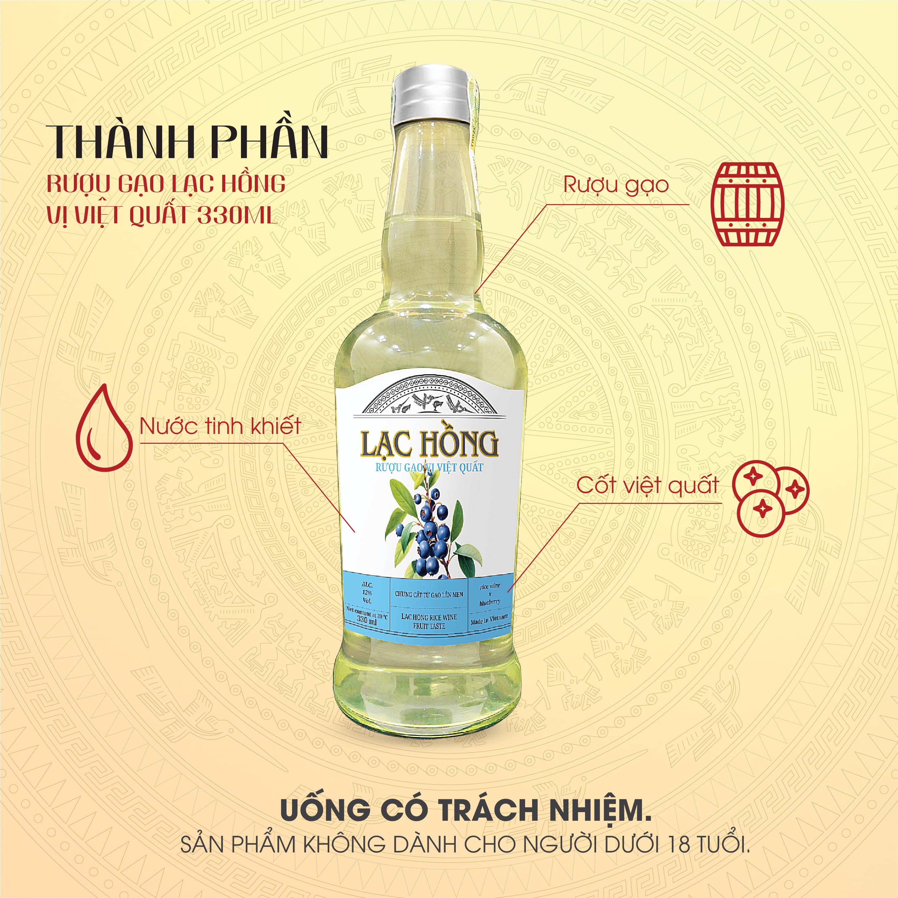 Rượu gạo Lạc Hồng vị Việt Quất (12%) Rượu gạo Lạc Hồng vị Việt Quất là sự kết hợp độc đáo giữa hương vị việt quất ngọt dịu và rượu gạo truyền thống Việt Nam.