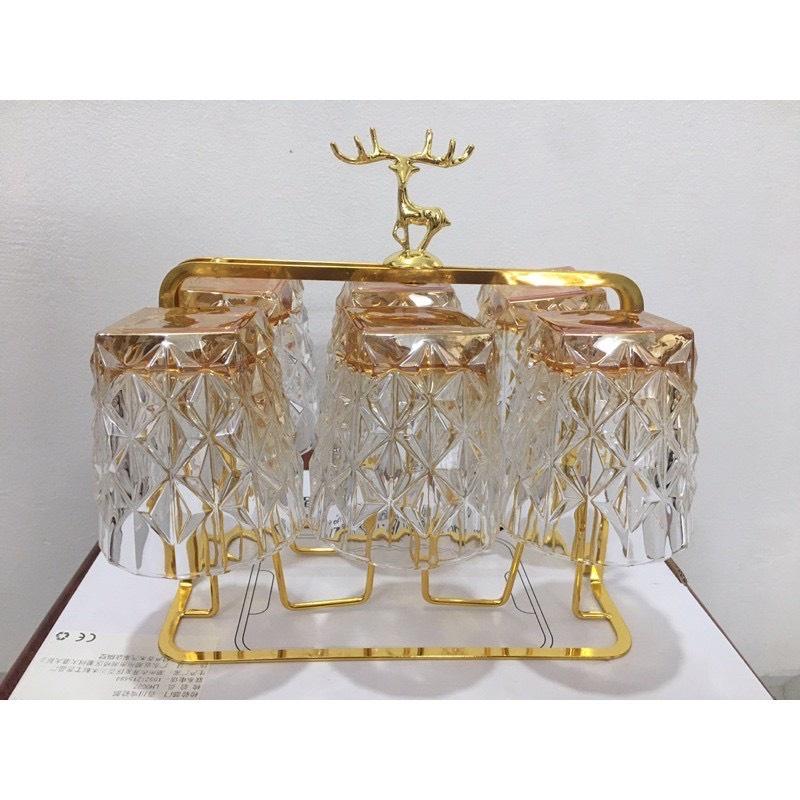 Combo Bộ 6 cốc thủy tinh cao cấp kèm giá úp tròn có khay hứng Combo gồm: 1 bình 6 cốc cốc 1 giá úp hươu 1 khay vương miện