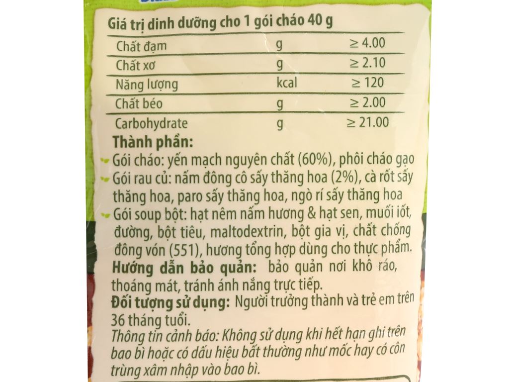 Thành phần: Gói cháo yến mạch nguyên chất (60%), phôi cháo gạo. Gói rau củ: Thịt Heo sấy thăng hoa (2%); cà rốt, paro, ngò rí sấy thăng hoa. Gói soup bột: hạt nêm nấm