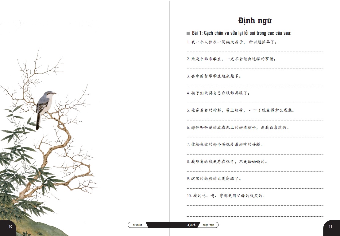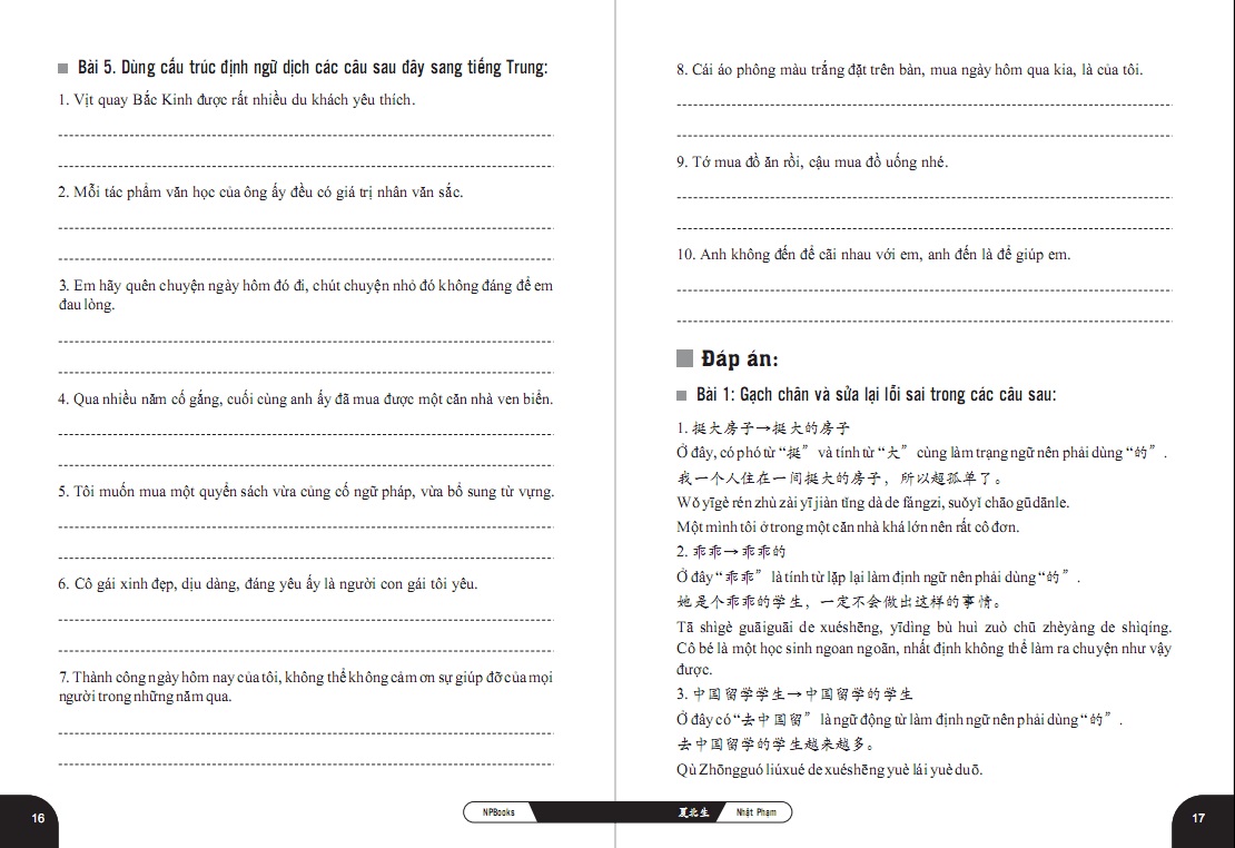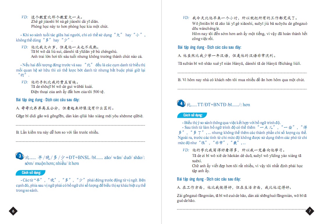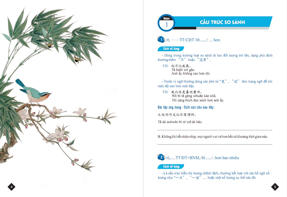 - ĐẶC_TRƯNG_NỔI_BẬT Sách với lối viết ngắn gọn, cụ thể, chia nhỏ các điểm thành từng cấu trúc tách biệt để người tự học hoàn toàn có thể hiểu và ứng dụng nhanh chóng. Sách là sự kết hợp giữa kinh nghiệm của tác giả Việt Nam và sự am hiểu sâu sắc về tiếng mẹ đẻ của tác giả Trung Quốc, đảm bảo hoàn toàn có thể tin tưởng được về độ chính xác. Sách đi đúng tinh thần hỗ trợ tối đa nên có ví dụ, tất cả chữ Hán xuất hiện đều có phiên âm giúp các bạn nhận thức cách đọc và tích lũy thêm từ vựng.