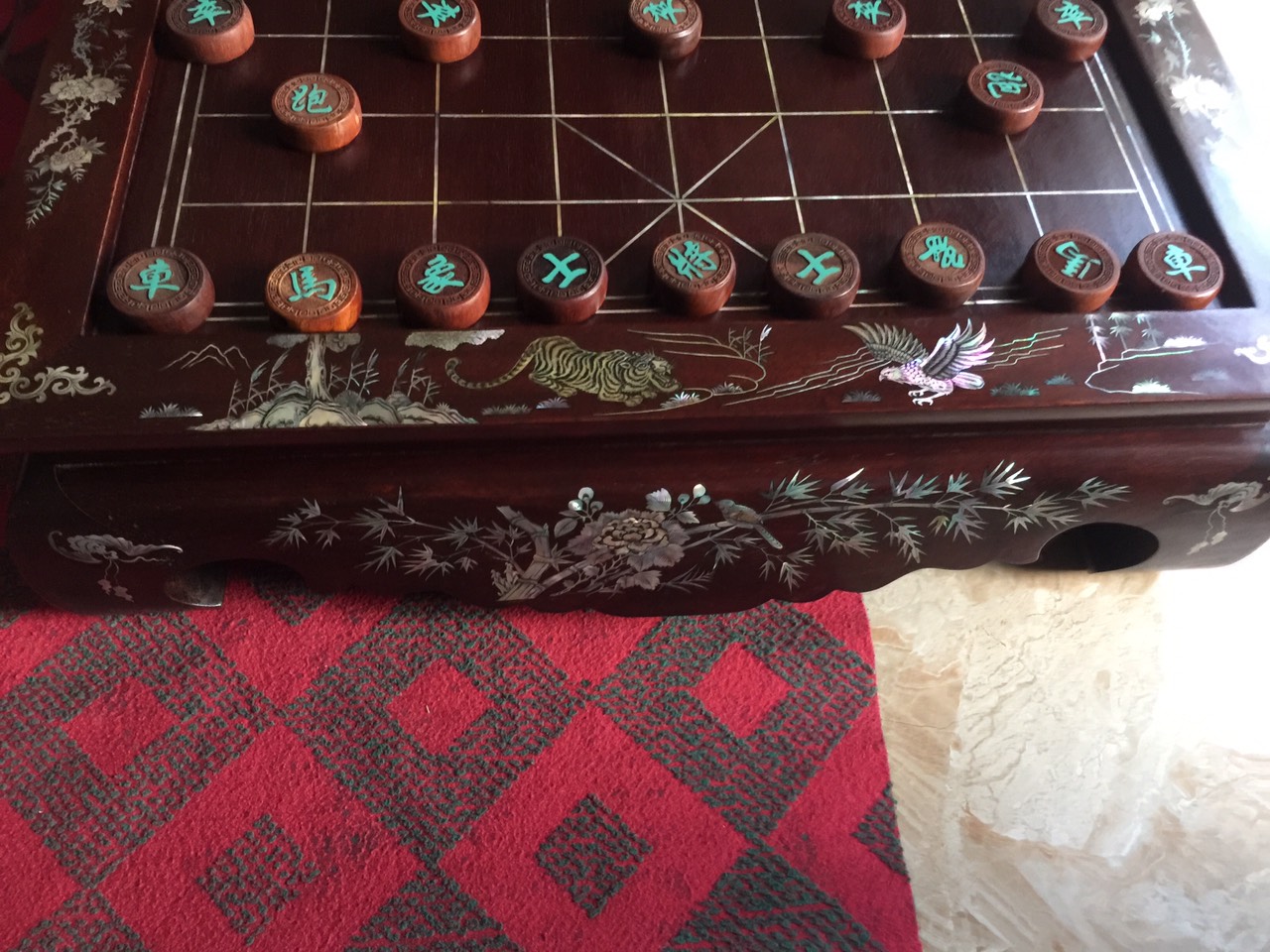 Bàn cờ tướng được làm bằng chất liệu gỗ gõ đỏ kết hợp với khảm ốc xà cừ và  vỏ bào ngư xanh đỏ .quân gỗ trắc tự nhiên 100% Kt bàn cờ 60×70 cao 20 cm ,kt quân cờ 4.5 dầy 1.5cm  _ Bàn cờ được thiết kế theo hình chữ nhật .Viền 2 cạnh có ngăn kéo khi chơi ,cũng như cất quân rất bắt mắt tiện ích .Khung viền dạ và mặt bàn cờ được khảm ốc và vỏ bào ưng xanh đỏ với độ tinh xảo kỳ công với độ chính xác cao .Quân cờ được tiện khắc quá tinh xảo kỳ công từng quân 1 với độ sắc nét cao .Bộ bàn cờ được làm và hoàn thiện do bàn tay khối óc tài hoa .Từ những người thợ giàu kinh nghiệm cũng như tay nghề cao trong làng nghề truyền thống .Chính vì thế bàn cờ bằng gỗ gõ ,quân gỗ trắc đã đáp ứng đầy đủ mọi tiêu trí cần thiết như ( Đẹp bền rẻ ) Thẩm mỹ nghệ thuật với chất lượng hoàn hảo