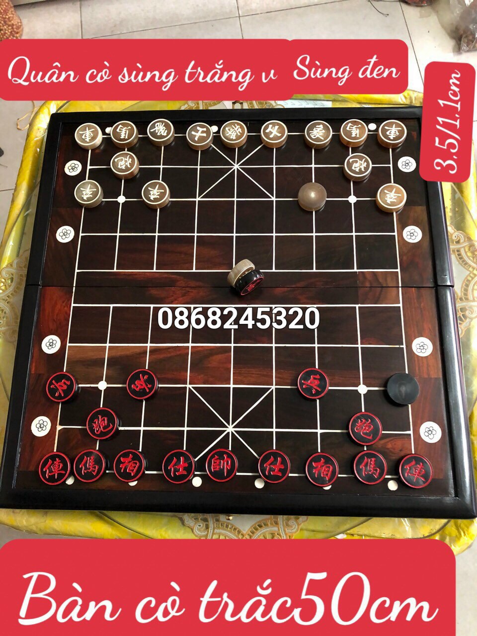 ✨Combo bộ bàn cờ tướng gỗ trắc kt 50×50×3cm + quân cờ sừng trắng đen kt 3.5×1.2cm