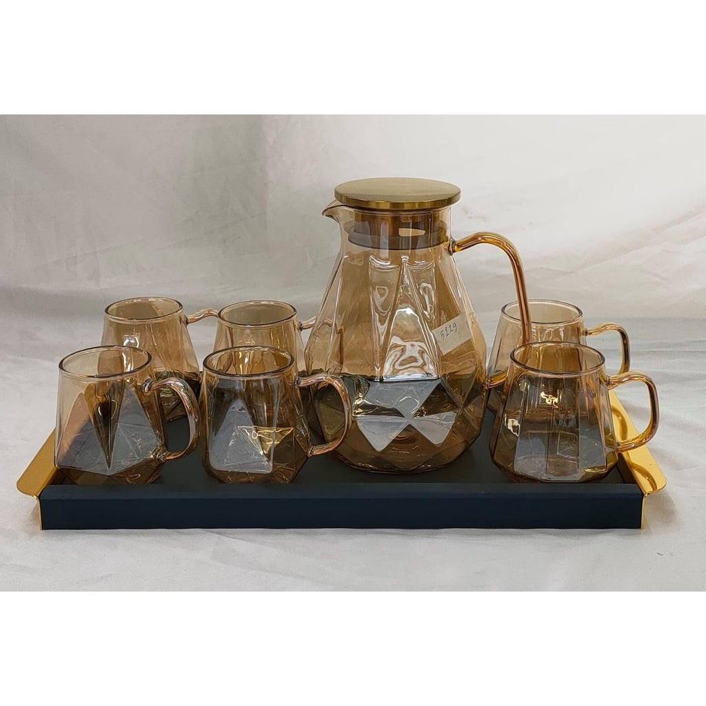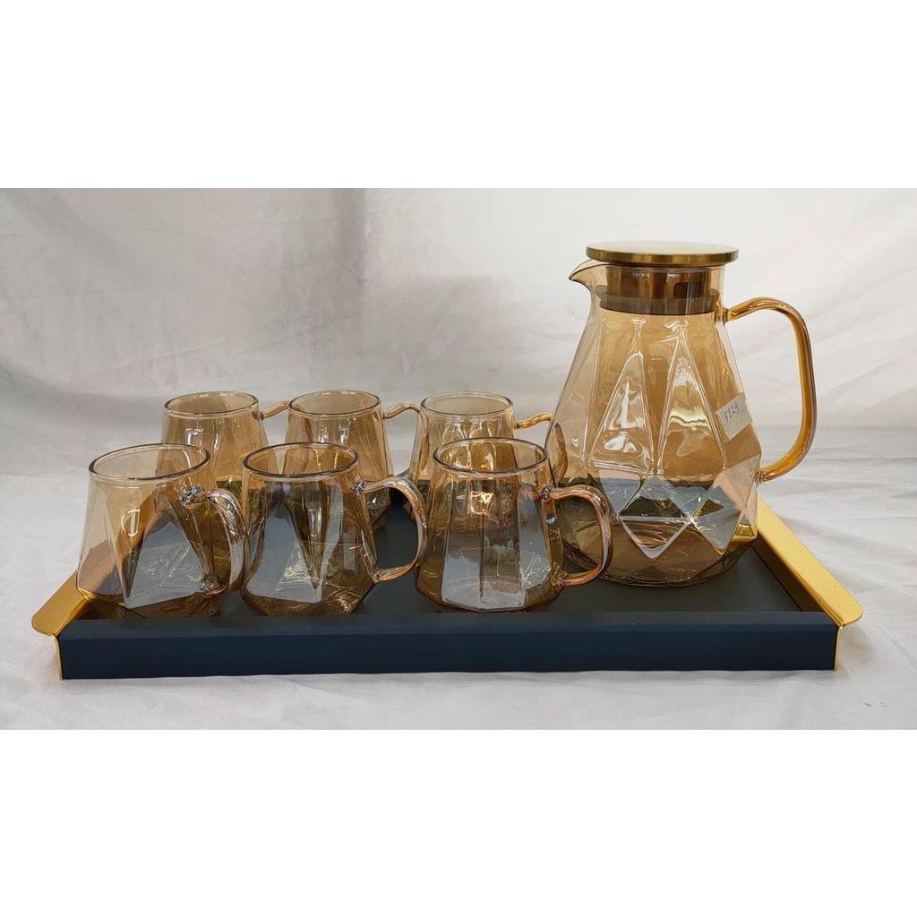 Bộ bình thuỷ tinh chịu nhiệt màu vàng gôn kèm 6 cốc phong cách Bắc Âu tạo ra một cảm giác sang trọng và vô cùng hiện đại