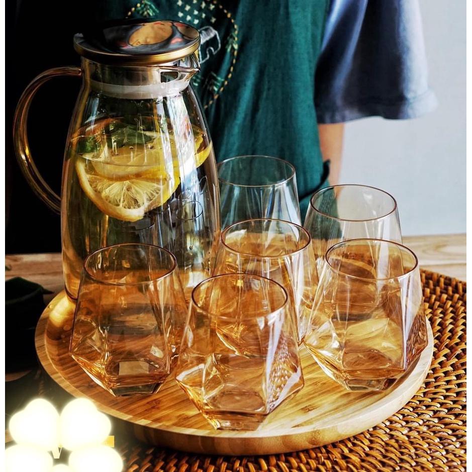 ✨Combo bộ bình đựng nước uống thủy tinh chịu nhiệt cao cấp kèm khay gỗ màu vàng