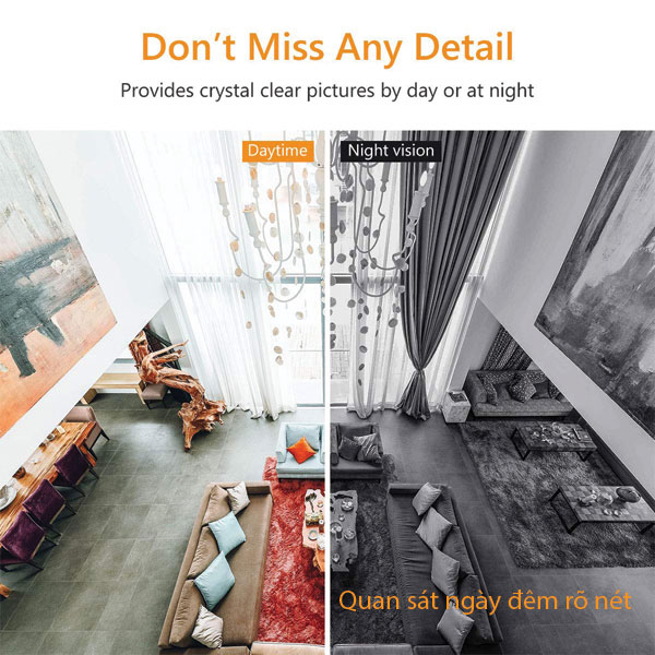 - Độ phân giải 3MP (2K – 2304×1296) cho hình ảnh chi tiết, sắc nét hơn Full HD - Góc quay linh hoạt 360° ngang, điều chỉnh dọc rộng – bao quát toàn bộ không gian - Phát hiện chuyển động thông minh, theo dõi tự động và cảnh báo tức thì - Tầm nhìn ban đêm bằng hồng ngoại lên tới 12 m – quan sát rõ cả trong bóng tối - Âm thanh hai chiều – vừa nghe vừa nói trực tiếp qua camera - Lưu trữ linh hoạt qua thẻ microSD lên tới 512 GB hoặc dịch vụ đám mây - Hỗ trợ điều khiển bằng giọng nói qua Alexa và Google Assistant - Kết nối Wi-Fi 2.4 GHz ổn định, dễ cài đặt và sử dụng - Thiết kế nhỏ gọn, phù hợp đặt bàn hoặc treo tường LƯU Ý KHI MUA HÀNG Cảm ơn quý khách đã quan tâm đến sản phẩm bên