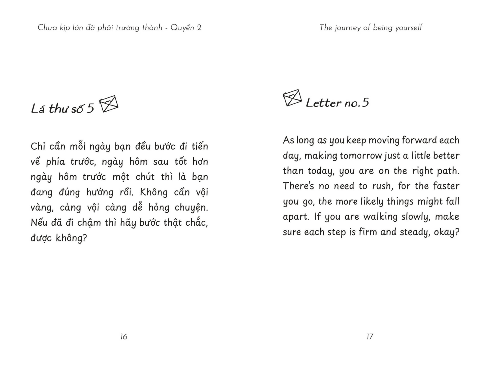 Cuốn sách là những lá thư tâm tình nhẹ nhàng được viết bằng 2 ngôn ngữ Việt - Anh sẽ nhắn nhủ bạn về sự đặc biệt của bản thân, tiếp thêm niềm tin để bạn không ngừng hoàn thiện trong thế giới người lớn, đồng thời nâng cao năng lực ngoại ngữ để chinh phục thế giới tươi đẹp.