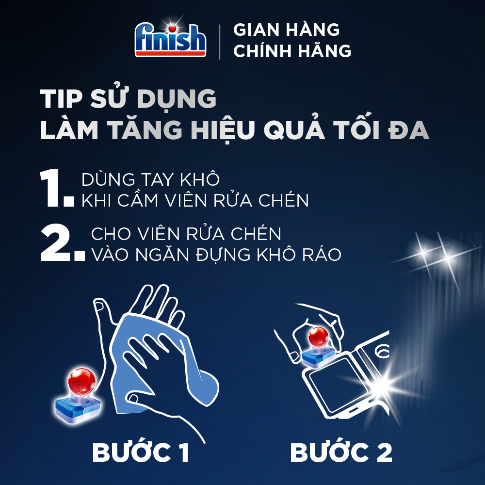 Hãng Finish khuyến cáo nên sử dụng 3 loại chất tẩy rửa riêng biệt để Bát đĩa sạch hơn, sáng bóng hơn và máy bền hơn. 3 loại chất tẩy rửa riêng biệt dùng cho