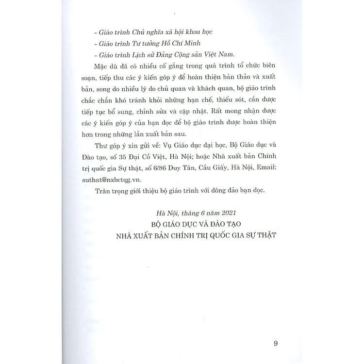 Bộ giáo trình lý luận chính trị gồm 5 cuốn dành cho bậc đại học hệ không chuyên lý luận chính trị. Bộ sách là tài liệu giảng dạy, học tập cho giảng viên, sinh viên các trường đại học theo chương trình mới do Bộ Giáo dục và Đào tạo và Nhà xuất bản Chính trị Quốc gia xuất bản. Bộ giáo trình được biên soạn theo tinh thần đổi mới cả về nội dung và phương pháp giảng dạy, tiếp cận với những phương pháp giáo dục mới, cập nhật những nghiên cứu, kiến thức lý luận chính trị mới, chú trọng liên hệ với thực tiễn công cuộc đổi mới, phát triển đất nước. Bộ giáo trình dành cho bậc đại học hệ không chuyên lý luận chính trị, cung cấp các vấn đề cơ bản nhất về chủ nghĩa Mác - Lênin, trọng tâm là về chủ nghĩa duy vật biện chứng, chủ nghĩa duy vật lịch sử, gắn với tư tưởng Hồ Chí Minh và đường lối, chủ trương của Đảng. Sách có nguồn gốc xuất xứ, rõ ràng, hợp pháp về bản quyền, có mã QRcode (mã định danh từng cuốn sách) và tem chống giả, là bản gốc, mới 100% chưa qua sử dụng của Nhà xuất bản Chính trị Quốc gia và Bộ GD&ĐT theo đúng quy định của pháp luật hiện hành. Giáo Trình Lịch Sử Đảng Cộng Sản Việt Nam (Dành Cho Bậc Đại Học Hệ Không Chuyên Lý Luận Chính Trị) Ngoài chương nhập môn, trình bày về đối tượng, chức năng, nhiệm vụ, nội dung và phương pháp nghiên cứu, học tập lịch sử Đảng Cộng sản Việt Nam, giáo trình có kết cấu gồm 03 chương: Chương 1 nêu quá trình Đảng Cộng sản Việt Nam ra đời và lãnh đạo đấu tranh giành chính quyền (1930 - 1945). Chương 2 nêu về quá trình Đảng lãnh đạo hai cuộc kháng chiến chống ngoại xâm, hoàn thành giải phóng dân tộc, thống nhất đất nước (1945 - 1975); Chương 3 nêu quá trình Đảng lãnh đạo cả nước quá độ lên chủ nghĩa xã hội và tiến hành công cuộc đổi mới (từ năm 1975 đến nay). Giáo trình cung cấp cho sinh viên những tri thức vừa cơ bản, vừa chuyên sâu, mang tính hệ thống về quá trình ra đời và lãnh đạo cách mạng của Đảng Cộng sản Việt Nam; cung cấp cơ sở lịch sử, củng cố niềm tin của thế hệ trẻ vào con đường cách mạng giải phóng dân tộc và phát triển đất nước; trang bị phương pháp nhận thức biện chứng, khách quan về quá trình Đảng ra đời và lãnh đạo cách mạng;… từ đó nâng cao hiểu biết lý luận, nắm bắt thực tiễn, vận dụng vào xem xét, đánh giá vai trò và sự lãnh đạo của Đảng, góp phần thiết thực vào công tác xây dựng Đảng ngày càng vững mạnh, đáp ứng yêu cầu nhiệm vụ mới trong quá trình công nghiệp hóa, hiện đại hóa đất nước, xây dựng thành công chủ nghĩa xã hội ở Việt Nam.   Giáo Trình Tư Tưởng Hồ Chí Minh (Dành Cho Bậc Đại Học Hệ Không Chuyên Lý Luận Chính Trị) Giáo trình do tập thể tác giả là những nhà nghiên cứu, nhà giáo dục có nhiều kinh nghiệm trong nghiên cứu, giảng dạy về tư tưởng Hồ Chí Minh, PGS.TS. Mạch Quang Thắng làm chủ biên; được biên soạn theo quan điểm đổi mới căn bản, toàn diện giáo dục và đào tạo. Giáo trình thể hiện nhiều kết quả nghiên cứu mới về tư tưởng Hồ Chí Minh, gắn với các nội dung học tập và làm theo tư tưởng, đạo đức, phong cách Hồ Chí Minh. Giáo trình được kết cấu gồm 6 chương, trình bày những vấn đề cơ bản của tư tưởng Hồ Chí Minh. Chương 1 đề cập những vấn đề chung nhất của môn học (khái niệm, đối tượng, phương pháp nghiên cứu và ý nghĩa học tập môn Tư tưởng Hồ Chí Minh); Chương 2 trình bày cơ sở, quá trình hình thành và phát triển tư tưởng Hồ Chí Minh. Các chương còn lại gồm các nội dung: Tư tưởng Hồ Chí Minh về độc lập dân tộc và chủ nghĩa xã hội; Tư tưởng Hồ Chí Minh về Đảng Cộng sản Việt Nam và Nhà nước của nhân dân, do nhân dân, vì nhân dân; Tư tưởng Hồ Chí Minh về đại đoàn kết toàn dân tộc và đoàn kết quốc tế; Tư tưởng Hồ Chí Minh về văn hóa, con người. Giáo trình góp phần giúp người học hiểu sâu sắc, toàn diện và đầy đủ hơn về vai trò, vị trí, ý nghĩa của tư tưởng Hồ Chí Minh, các nội dung cơ bản trong tư tưởng Hồ Chí Minh, từ đó vận dụng, liên hệ với thực tiễn học tập, rèn luyện, xây dựng nhân cách để trở thành công dân tốt, đóng góp vào công cuộc xây dựng đất nước.