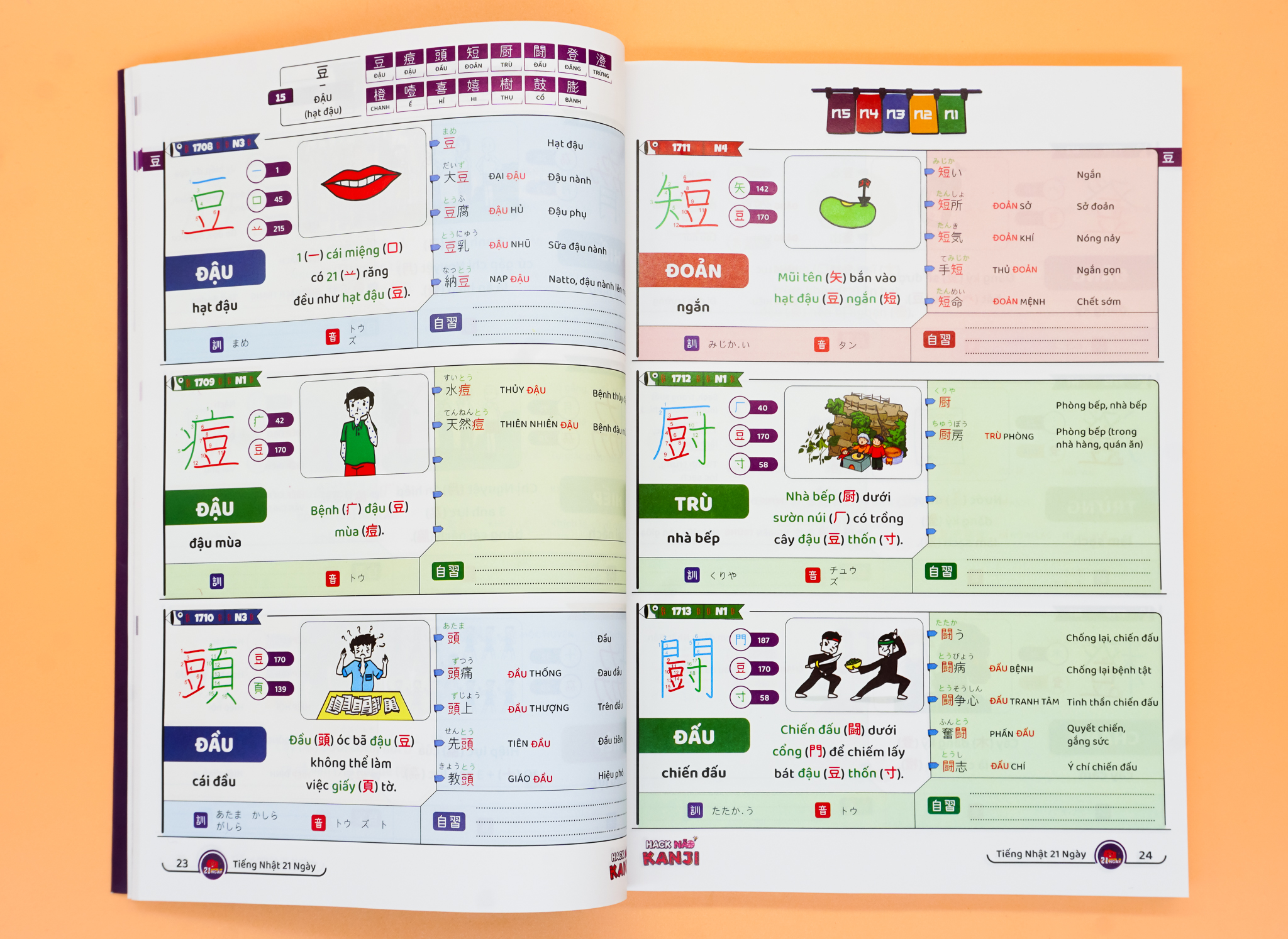 Cách viết, âm đọc, nghĩa của 428 chữ Kanji cơ bản nhất Các chữ Kanji đều kèm cụm từ vựng Hình ảnh minh họa sống động vui nhộn Cách học viết Kanji nhanh và chính