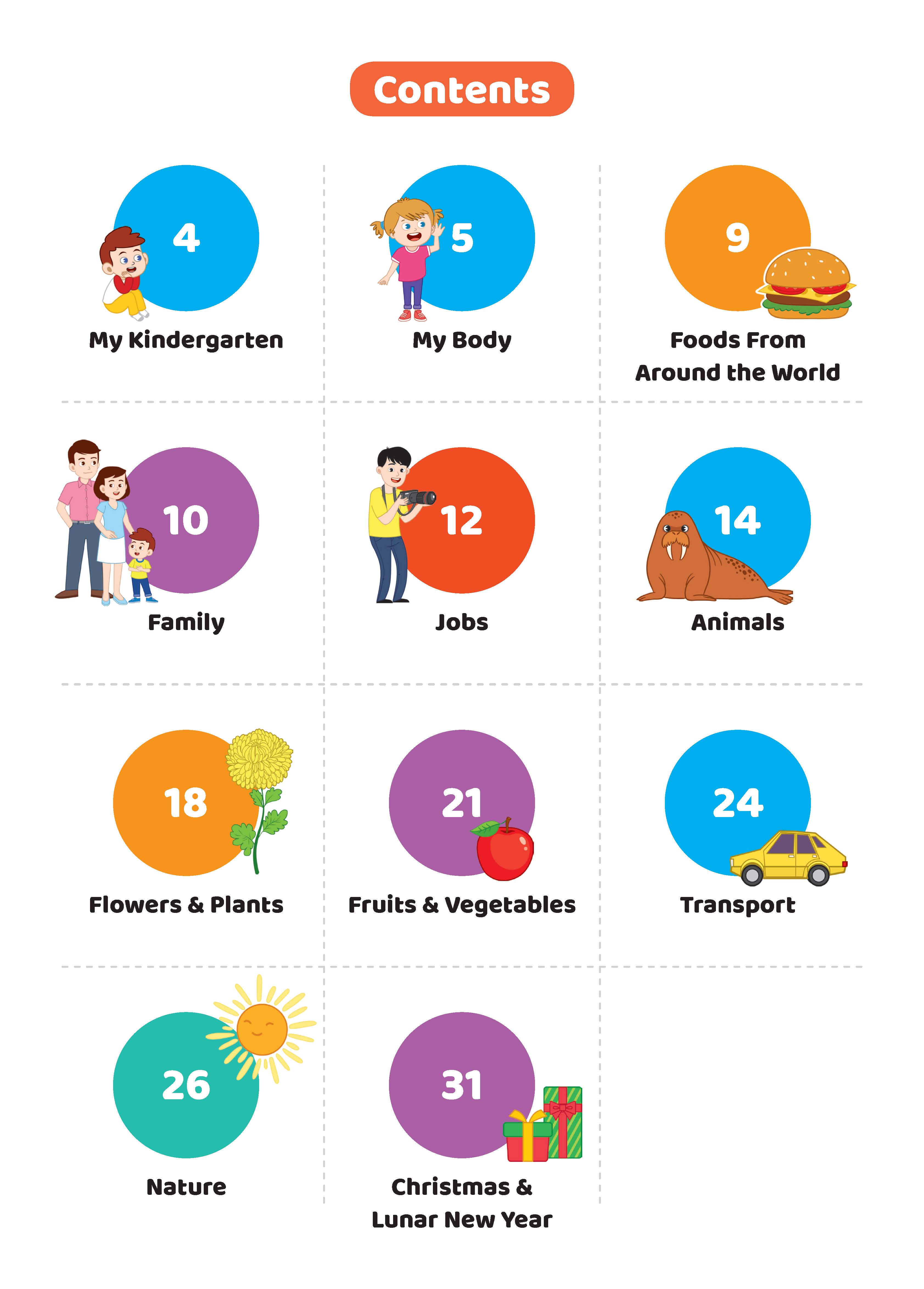 Exploring the World Around Us bao gồm các chủ đề như động vật, thực vật, giao thông, nhà cửa & gia đình cũng như nghề nghiệp.