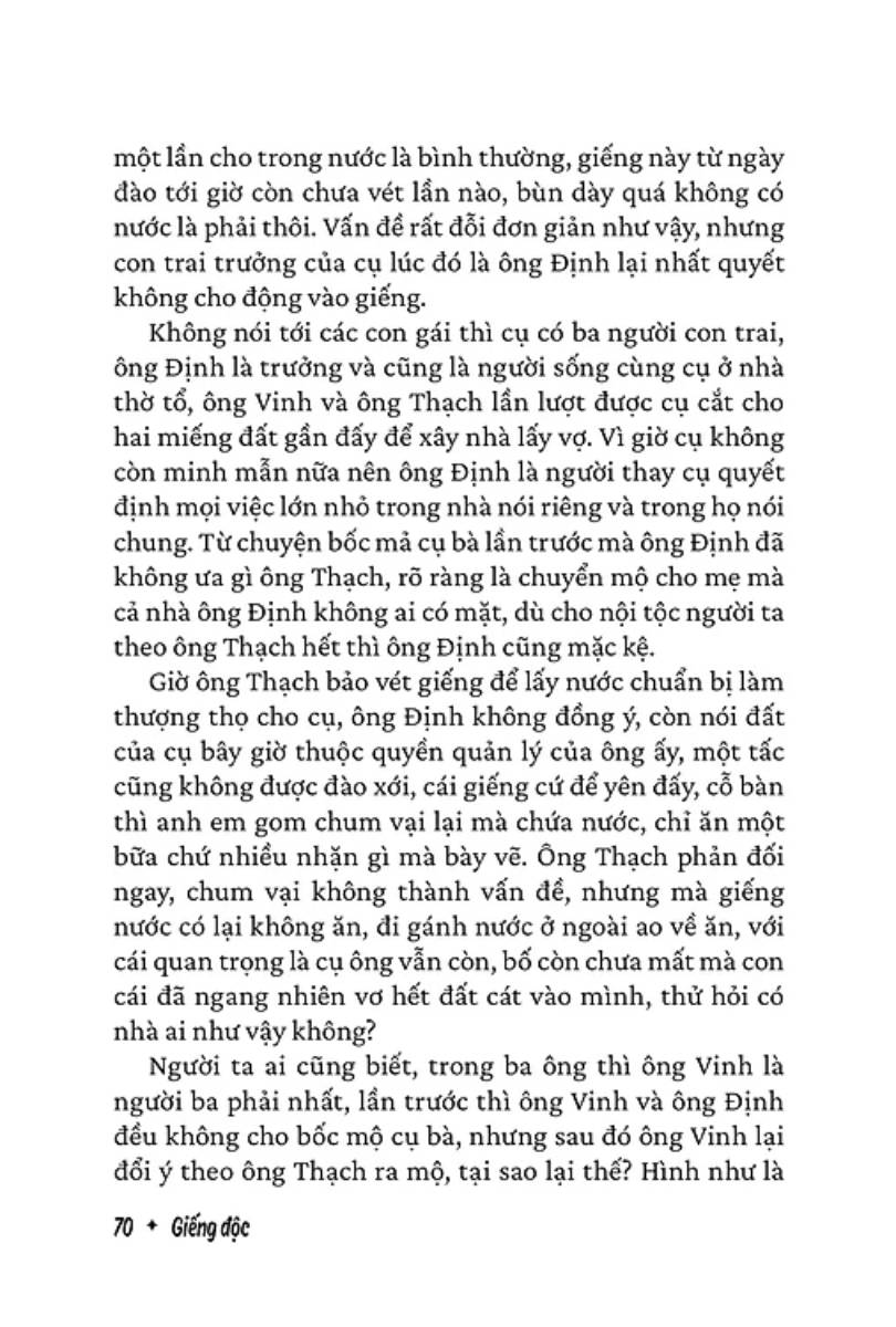 Giếng Độc mở đầu bằng hai đám tang trong cùng một ngày, của cùng một gia đình. Từ sự bất thường ấy mà chính người nhà rồi đến người làng hồ hởi khơi lại quá khứ để lục tìm manh mối, xem cớ vì sao lại có chuyện trùng hợp đáng sợ đến thế xảy ra?