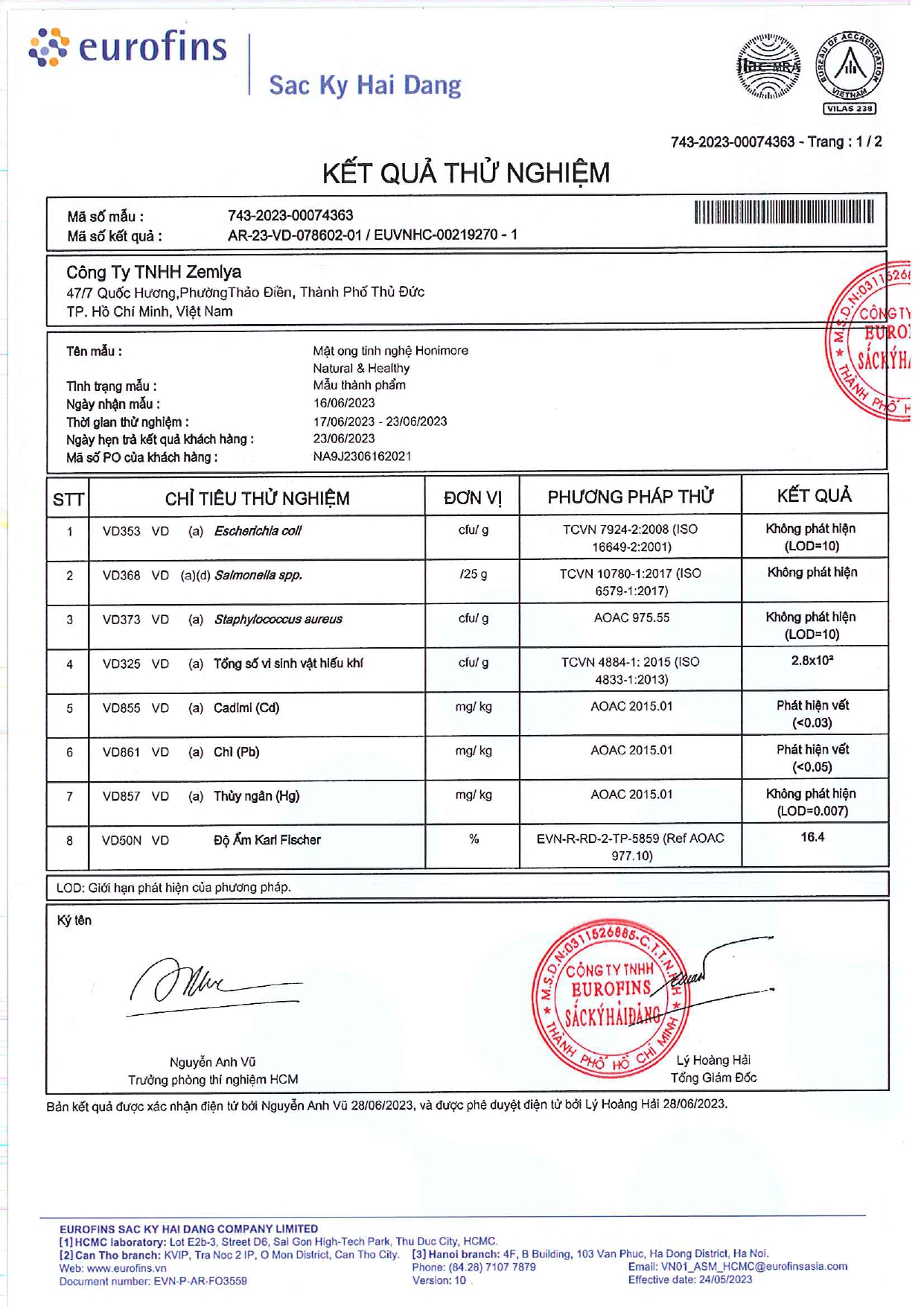 Mật ong Rừng Nhiệt Đới và Honimore là 2 thương hiệu thuộc sở hữu của Công ty TNHH Zemlya, với hơn 40 năm kinh nghiệm trong sản xuất mật ong. Các sản phẩm thuộc 2 thương hiệu này hiện đã có mặt ở tất cả các hệ thống siêu thị lớn của Việt Nam và nước ngoài. -------------------------------------------------------------------------- I. THÔNG TIN SẢN PHẨM - Tên sản phẩm: Mật ong Chanh - Thương hiệu: Rừng Nhiệt Đới - Khu vực khai thác: Các cánh rừng ở khắp 3 miền - Thành phần: 93% mật ong chín và 7% bột chanh - Nhà sản xuất: Công ty TNHH Zemlya (129/3 đường 154, phường Tân Phú, Thành phố Thủ Đức, Tp.HCM) - Quy cách đóng gói: chai thủy tinh - Khối lượng: 360g/chai - Hạn sử dụng: 2 năm kể từ ngày sản xuất - Chứng nhận Vệ sinh an toàn thực phẩm số 2857/2023/BQLATTPHCM do Ban quản lí An toàn thực phẩm TPHCM cấp ngày 18/07/2023 - Giấy kiểm nghiệm số AR-23-VD-065594-01 được cấp bởi Eurofins II. ĐẶC ĐIỂM NỔI BẬT Mật ong chanh là sản phẩm tiện lợi 2 trong 1, là sự kết hợp tinh túy
