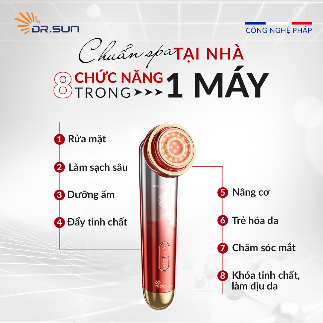 COMBO làm đẹp chuẩn spa tại nhà - máy triệt lông DR SUN PRO và máy nâng cơ, đẩy tinh chất DR SUN VENUS 5.0 MÁY TRIỆT LÔNG DR SUN PRO Siêu phẩm máy triệt lông tại nhà giúp chăm da láng mịn, hoàn hảo với 3 tính năng trong 1 chiếc máy nhỏ gọn: • Công nghệ IPL: Các xung ánh sáng có bước sóng 420-1200nm, tiến sâu và tác động vào tận gốc lỗ chân lông, làm chúng yếu đi và tự rụng • Công nghệ triệt lạnh ICE COOL, nhiệt độ triệt xuống chỉ còn 10*C. • Đầu triệt bikini riêng: việc triệt những vùng da dễ bị tổn thương như vùng da bikini sẽ trở nên dễ dàng, an toàn và hiệu quả hơn. • Trẻ hóa da và giảm mụn: Các bước sóng ngắn được tích hợp trong máy giúp tác động sâu vào các tầng biểu bì của da, tăng sản sinh collagen, giúp da trắng sáng, mờ vết thâm.  • 6 cấp độ xung: phù hợp với tất cả các loại da dù là da nhạy cảm nhất, đem lại cảm giác dễ chịu, thoải mái khi sử dụng sản phẩm. MÁY NÂNG CƠ VÀ ĐẨY TINH CHẤT DR SUN VENUS 5.0 • Sử dụng sóng rung 12000 lần/phút tần số cao cùng đầu silicon mềm mại, giúp làm sạch bụi bẩn bám trên bề mặt da, hỗ trợ quá trình dưỡng da • ion dương giúp đẩy sạch cặn bẩn tồn đọng lâu ngày sâu trong lỗ chân lông, cải thiện làn da mụn cám, mụn đầu đen và các vấn đề về da mụn. • sóng RF sinh nhiệt 40 độ C, giúp sưởi ấm, giữ ẩm bằng ion âm tích hợp ánh sáng đỏ và cam để các thành phần làm đẹp thấm sâu vào từng lớp biểu bì trên da, tăng khả năng hấp thụ mỹ phẩm dưỡng da lên tới 80% • Công nghệ EMS tăng hiệu quả nâng cơ • Sử dụng chế độ làm mát 5 độ C giúp thu nhỏ lỗ chân lông, dưỡng ẩm và hấp thụ tối đa các dưỡng chất đã thẩm thấu vào da. Đồng thời giảm các vấn đề về mụn, giảm sưng, tấy đỏ và làm dịu da. • Ánh sáng xanh có thể tiêu diệt vi khuẩn trên da, ngăn chặn sự lây lan của tình trạng viêm nhiễm, ngăn chặn mụn tận gốc. • Ánh sáng đỏ tăng cường lưu thông máu, cho làn da hồng hào, trắng mịn