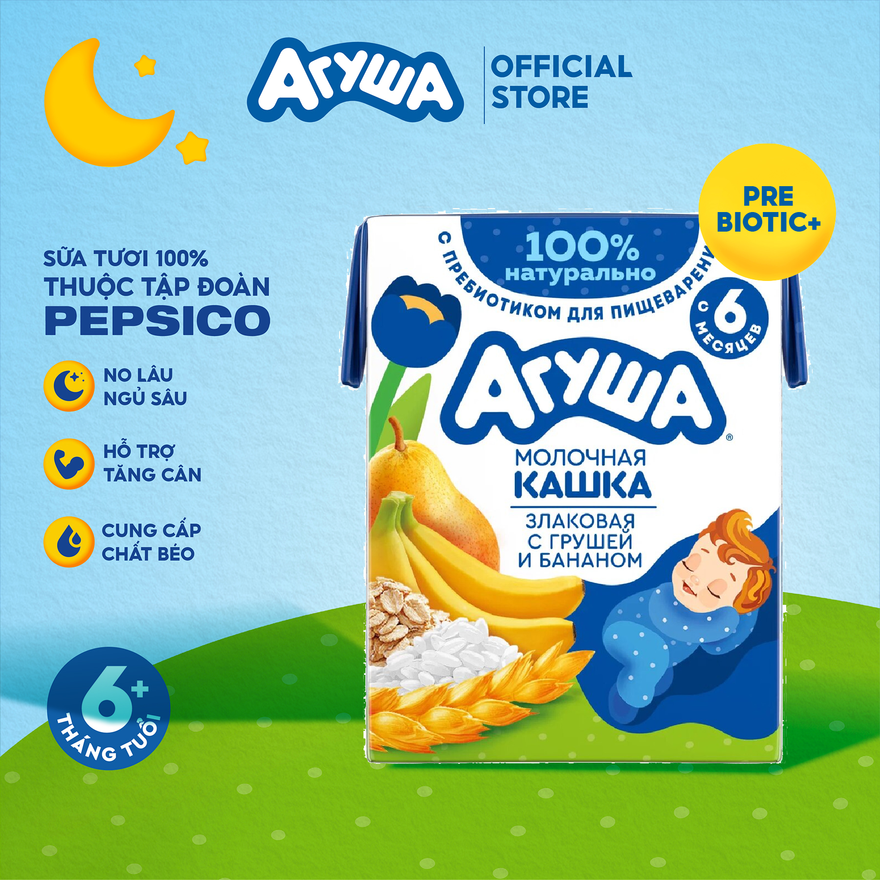 - Sữa đêm ăn dặm ngũ cốc vị lê và chuối Agusha 200ml: Sữa thường (77%), nước, đường, ngũ cốc (4.5% bột gạo, bột lúa mì, bột yến mạch), prebiotic, hương vị tự nhiên, bột trái cây lê, chuối (<2%).