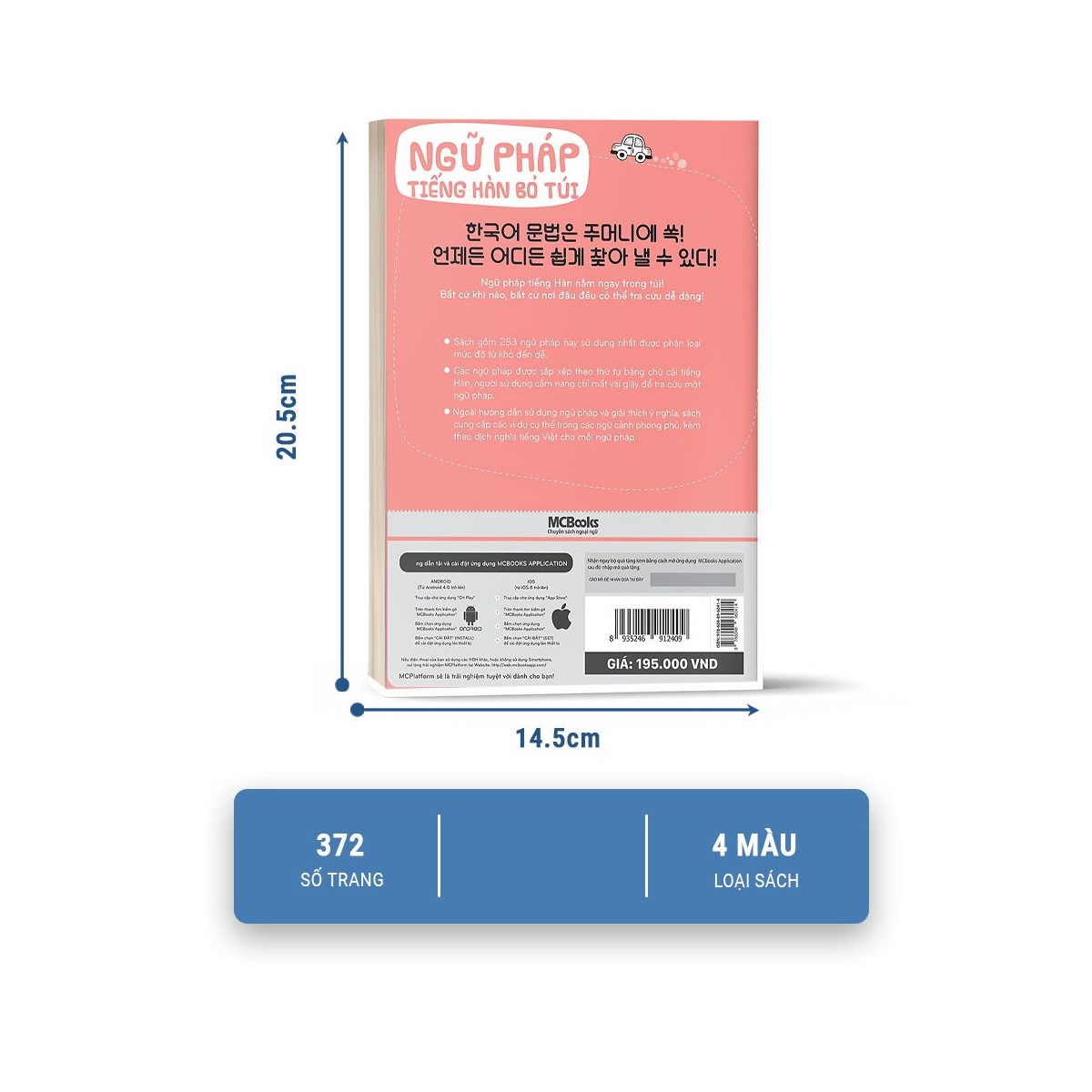 Bạn muốn áp dụng một ngữ pháp đã học, nhưng lại không dám sử dụng vì không tài nào nhớ nổi các trợ từ đi kèm? Bạn muốn mình có thể hiểu và vận dụng thành thạo được các ngữ pháp tiếng Hàn theo nhiều cách khác nhau, nhưng lại không muốn mang theo cuốn sách giáo trình bên mình? Hiểu được những khó khăn mà một người theo học ngoại ngữ thường gặp phải, cuốn sách “Ngữ pháp tiếng Hàn Bỏ Túi” dưới dạng một cuốn cẩm nang bỏ túi, tổng hợp phần lớn những ngữ pháp quan trọng và phổ biến trong tiếng Hàn mà một người học tiếng có thể bắt gặp trong quá trình nghiên cứu và học tập.