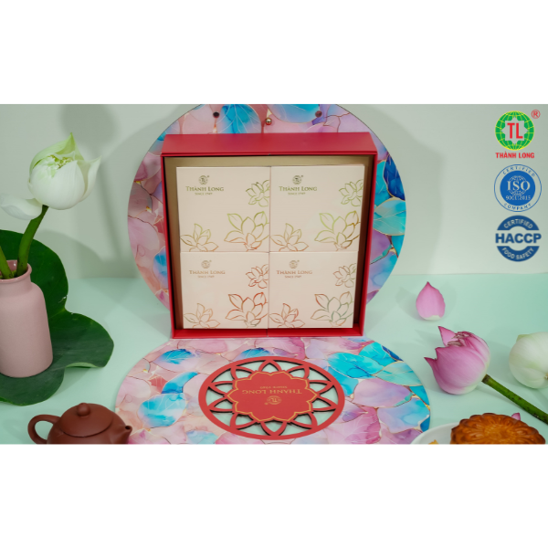 Bộ hộp Bánh trung thu Phát Đạt - Thành Long gồm 4 bánh: Nhân gà quay lạp xưởng (150g) Nhân đậu xanh hạt dưa (150g) Nhân hạt sen (150g) Nhân dừa sầu riêng (150g) Hạn