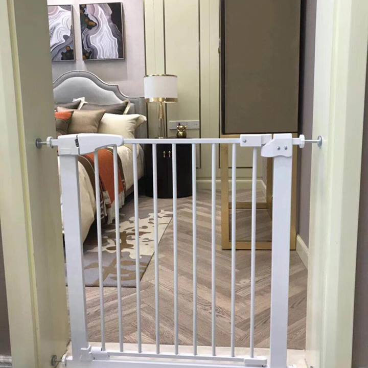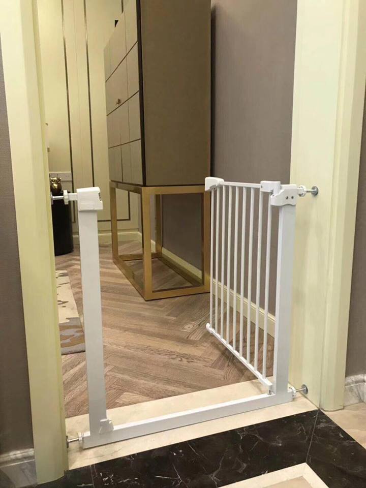 Chắn cửa, Chắn cầu thang   Kích thước: rộng 72-85cm, cao 76cm Thanh nối: Rộng 10cm, cao 76cm   Thanh to + thanh nối 10cm: dùng cho cửa có kích thước 90cm trở lên   Chắn cầu thang được làm từ ống thép sơn tĩnh điện, các linh kiện nhựa ABS cao cấp.   Ưu điểm:   Thiết kế thông minh, không cần khoan hay bắt vít   Cửa mở được hai chiều, thiết kế lò xo tự đóng khi ra vào. Đặc biệt thiết kế mới, khi mở cửa một góc 90 độ thì cửa sẽ không tự đóng, giúp thuận tiện hơn khi bé không có nhà hoặc người lớn cần bế bé hay bê vác đồ phải dùng đến cả hai tay, khi đó không cần phải mở cửa thanh chắn để ra vào.   Cửa thiết kế rộng hơn (60cm) -- Người lớn ra vào thuận tiện hơn   Thêm một lần khóa bảo vệ, để mở cửa cần ấn cả hai nút ở tay nắm, đồng thời nhấc cửa lên trên mới có thể mở được cửa, đảm bảo an toàn cho bé.   Vít cố định thiết kế chống trượt thông minh nên lắp đặt dễ dàng mà lại đảm bảo chắc chắn.