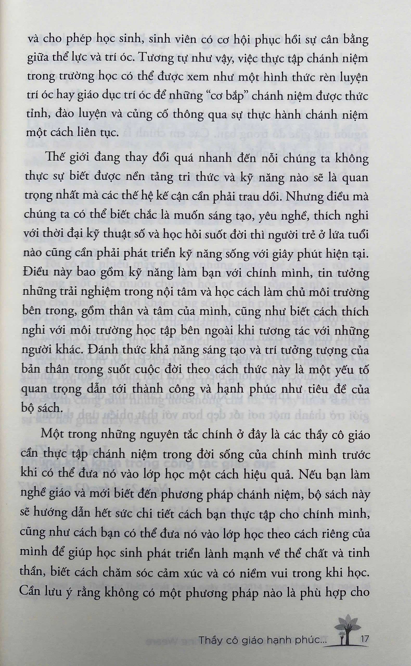 Đánh thức khả năng sáng tạo và trí tưởng tượng của bản thân trong suốt cuộc đời theo cách thức này là một yếu tố quan trọng dẫn tới thành công và hạnh phúc như tiêu đề của bộ sách. Một trong những nguyên tắc chính ở đây là các thầy cô giáo cần thực tập chánh niệm trong đời sống của chính mình trước khi có thể đưa nó vào lớp học một cách hiệu quả. Nếu bạn làm nghề giáo và mới biết đến phương pháp chánh niệm, bộ sách này sẽ hướng dẫn hết sức chi tiết cách bạn thực tập cho chính mình, cũng như cách bạn có thể đưa nó vào lớp học theo cách riêng của mình để giúp học sinh phát triển lành mạnh về thể chất và tinh thần, biết cách chăm sóc cảm xúc và có niềm vui trong khi học. Cần lưu ý rằng không có một phương pháp nào là phù hợp cho mọi hoàn cảnh. Cái hay của cách nhìn này là cho bạn một loạt các lựa chọn để thử nghiệm và trên hết là nhắc bạn nhớ rằng chính sự sáng tạo của riêng bạn, được nuôi dưỡng bởi sự thực tập chánh niệm, sẽ mang đến muôn vàn những cơ hội mới và đầy thú vị. Nói một cách thực tế thì học trò của bạn sẽ là người giúp khơi mở nguồn tuệ giác đó trong bạn. Các em chính là những người thầy chánh niệm vĩ đại nhất của bạn. Điểm hay của phương thức tiếp cận này là nó có thể bắt nguồn từ tình yêu nghề và tấm lòng mong mỏi học trò tiến bộ, được ấp ủ và truyền đạt bởi chính trực giác và kinh nghiệm thực tiễn của bạn; tất cả những điều này đều dựa vào công phu thực tập trong từng thời khắc của bạn. Theo như tôi nghiệm thấy, những băn khoăn, học hỏi, quán chiếu cứ lớn lên không ngừng trên mảnh đất nuôi dưỡng ấy.
