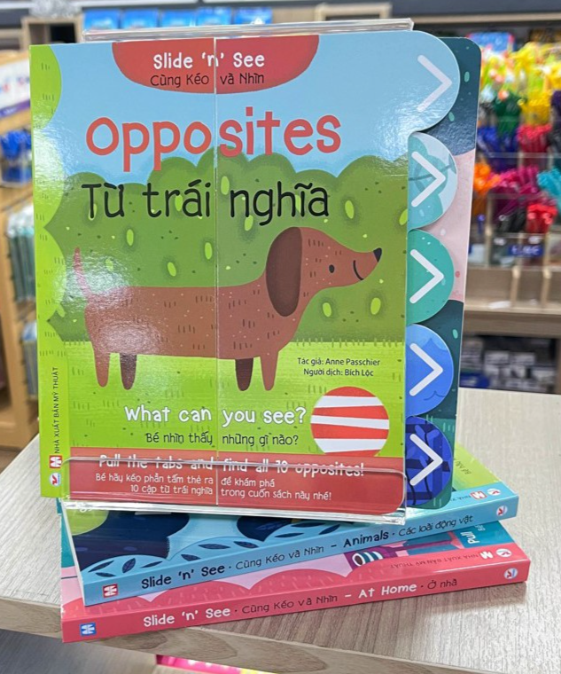 Bộ sách ""Slide and see"" cho bé tương tác trực tiếp kéo phần tấm thẻ ra để khám phá bí mật đằng sau mỗi trang sách. Mỗi cuốn sách được sáng tạo dựa trên một chủ đề và bao gồm các từ vựng Tiếng Anh cho bé vừa chơi vừa học: