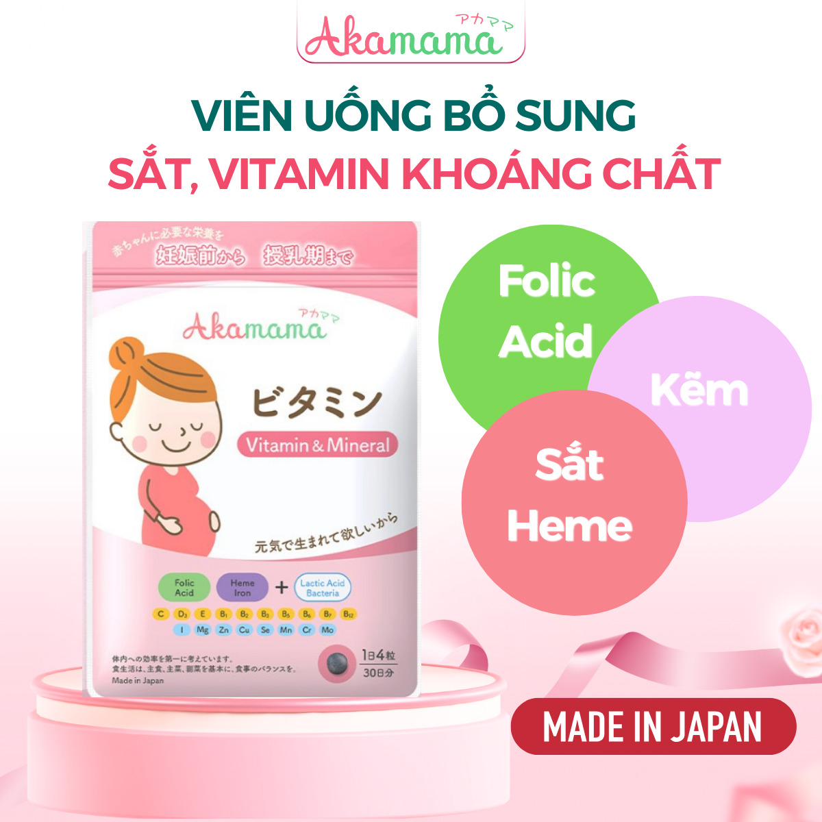 Viên Uống Bổ Sung Sắt, Acid Folic, Vitamin Tổng Hợp, Khoáng Chất Cho Mẹ Bầu, Hỗ Trợ Tiêu Hoá, Hạn Chế Rạn Da, Viên Nhỏ, Không Mùi, Vị, Dễ Uống, Akamama Nhật Bản Túi 120 Viên