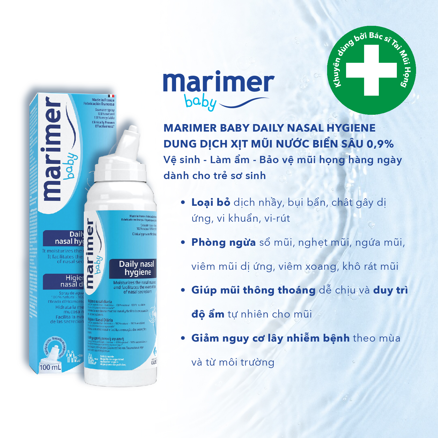 THÀNH PHẦN: Nước biển đẳng trương, nước tinh khiết. CHỈ ĐỊNH: Sử dụng hàng ngày, - Marimer Daily Nasal Hygiene: dành cho người lớn và trẻ em từ 3 tuổi. - Marimer Baby Daily Nasal Hygiene: dành cho trẻ