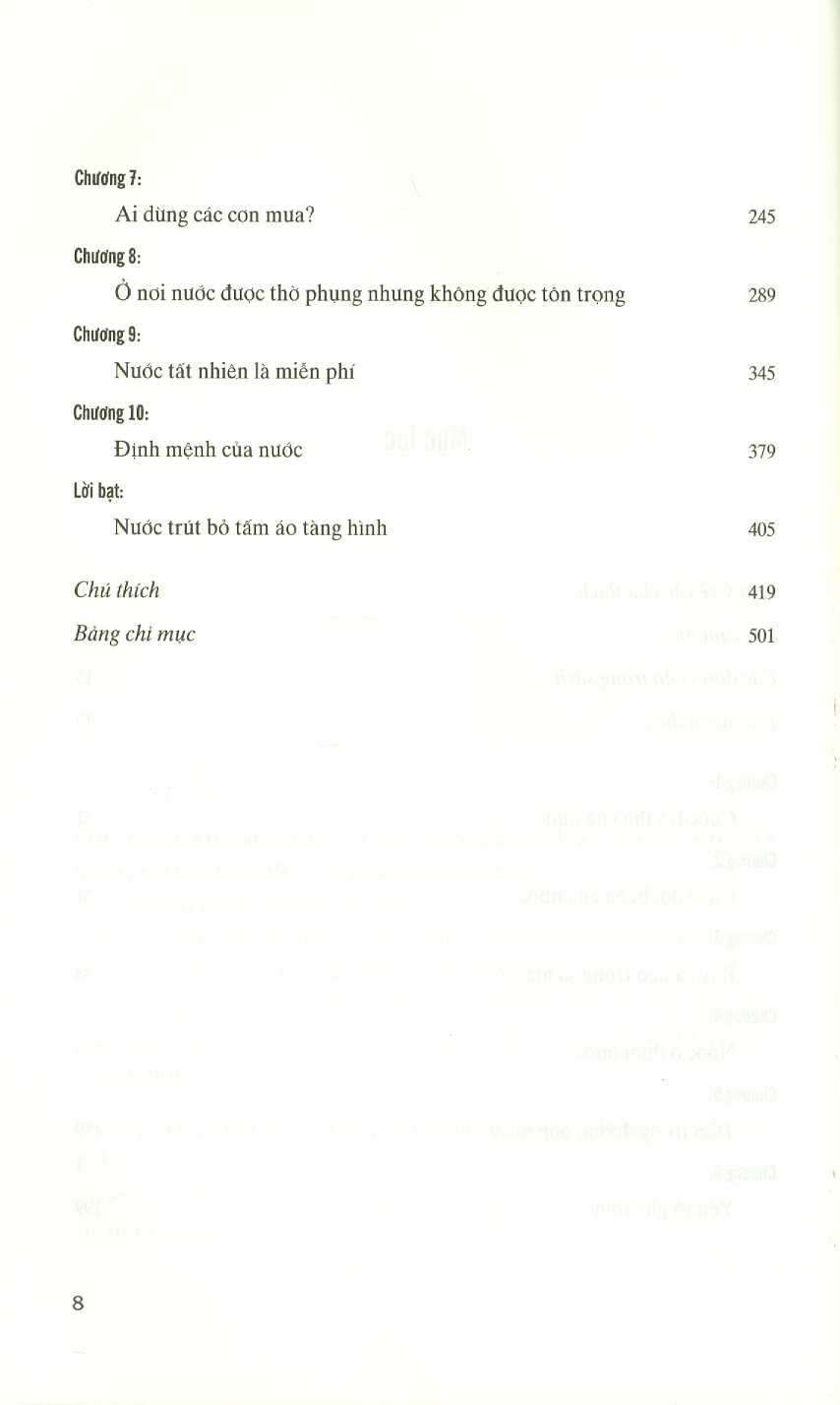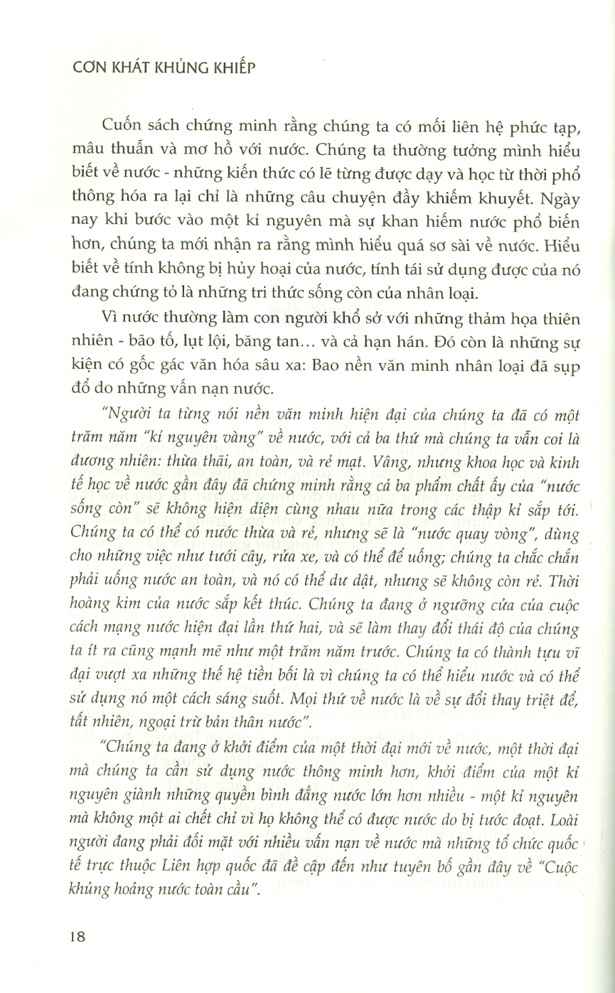 " Nền văn minh hiện đại của chúng ta đã có một trăm năm “kỉ nguyên vàng” về nước, với cả ba đặc tính mà chúng ta vẫn coi là hiển nhiên: thừa thãi, an toàn, và rẻ mạt. Vâng, nhưng khoa học và kinh tế học về nước gần đây đã chứng minh rằng cả ba phẩm chất ấy của “nước sống còn” sẽ không hiện diện cùng nhau nữa trong các thập kỉ sắp tới. Chúng ta có thể có nước thừa và rẻ, nhưng sẽ là “nước quay vòng, dùng cho những việc như tưới cây, rửa xe; chúng ta chắc chắn phải uống nước an toàn, và nó có thể dư dật, nhưng sẽ không còn rẻ nữa. Thời hoàng kim của nước sắp kết thúc. Chúng ta đang ở ngưỡng cửa của cuộc cách mạng nước hiện đại lần thứ ”
