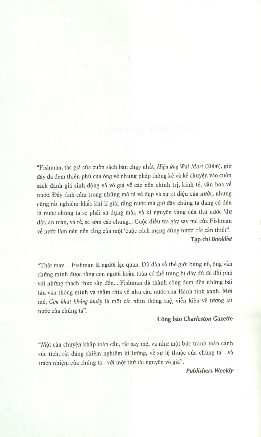 “Fishman, tác giả của cuốn sách bán chạy nhất, Hiệu ứng Wal-Mart (2006), giờ đây đã đem thiên phú của ông về những phép thống kê và kể chuyện vào cuốn sách đánh giá sinh động và vô giá về các nền chính trị, kinh tế, văn hóa về nước. Đầy tình cảm trong những mô tả vẻ đẹp và sự kì diệu của nước, nhưng cũng rất nghiêm khắc khi lí giải rằng nước mà giờ đây chúng ta đang có đều là nước chúng ta sẽ phải sử dụng mãi, và kỉ nguyên vàng của thứ nước dự dật, an toàn, và rẻ, sẽ sớm cáo Cuộc điều tra gây say mê của Fishman về nước làm nên nền tảng của một cuộc cách mạng dùng nước rất cần thiết” - Tạp chí Booklist