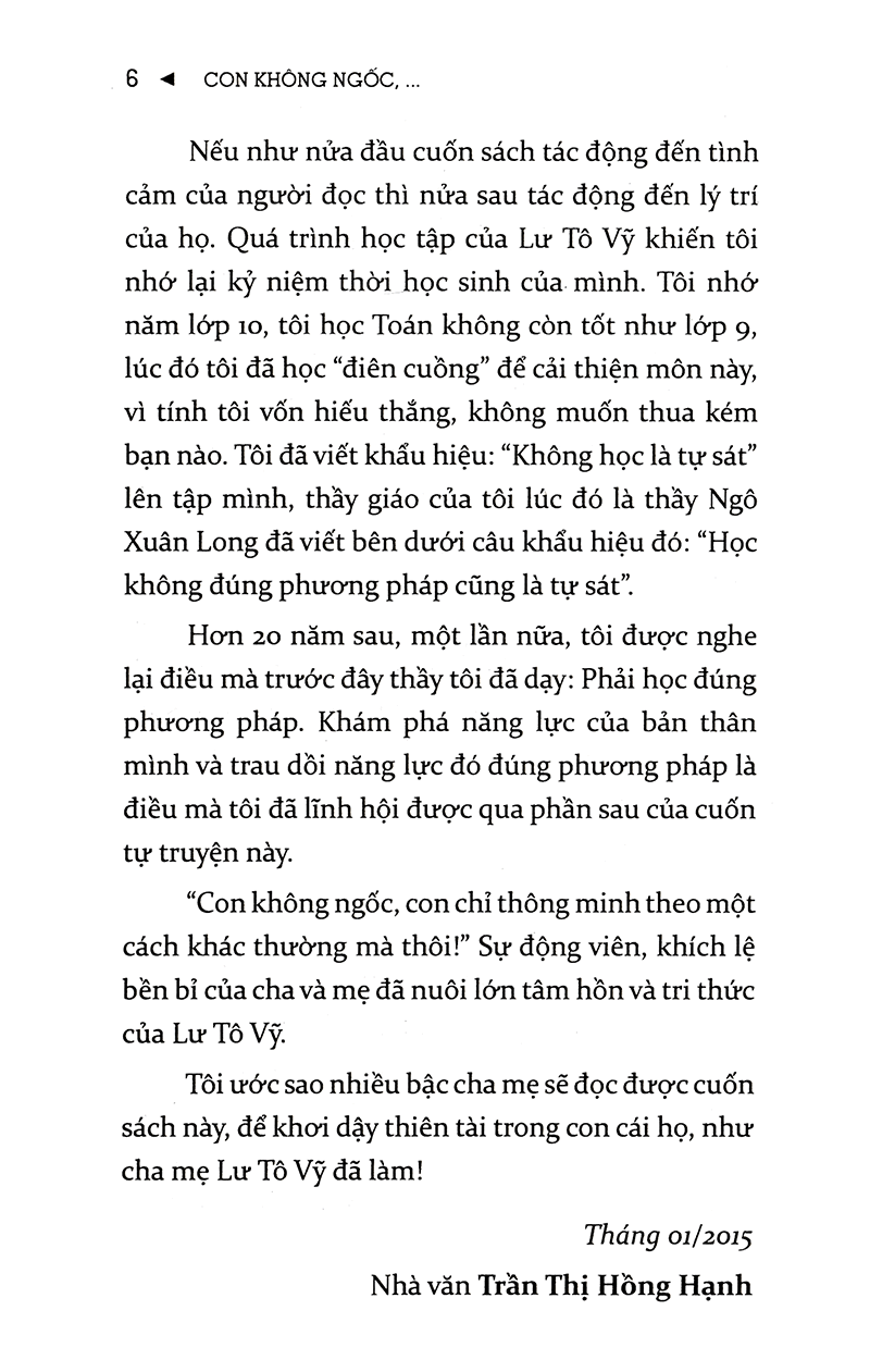Con không ngốc, con chỉ thông minh theo một cách khác là một cuốn hồi ký thuật lại hành trình trưởng thành của Lư Tô Vỹ, một hành trình kỳ diệu nhất mà cũng chân thực nhất.
