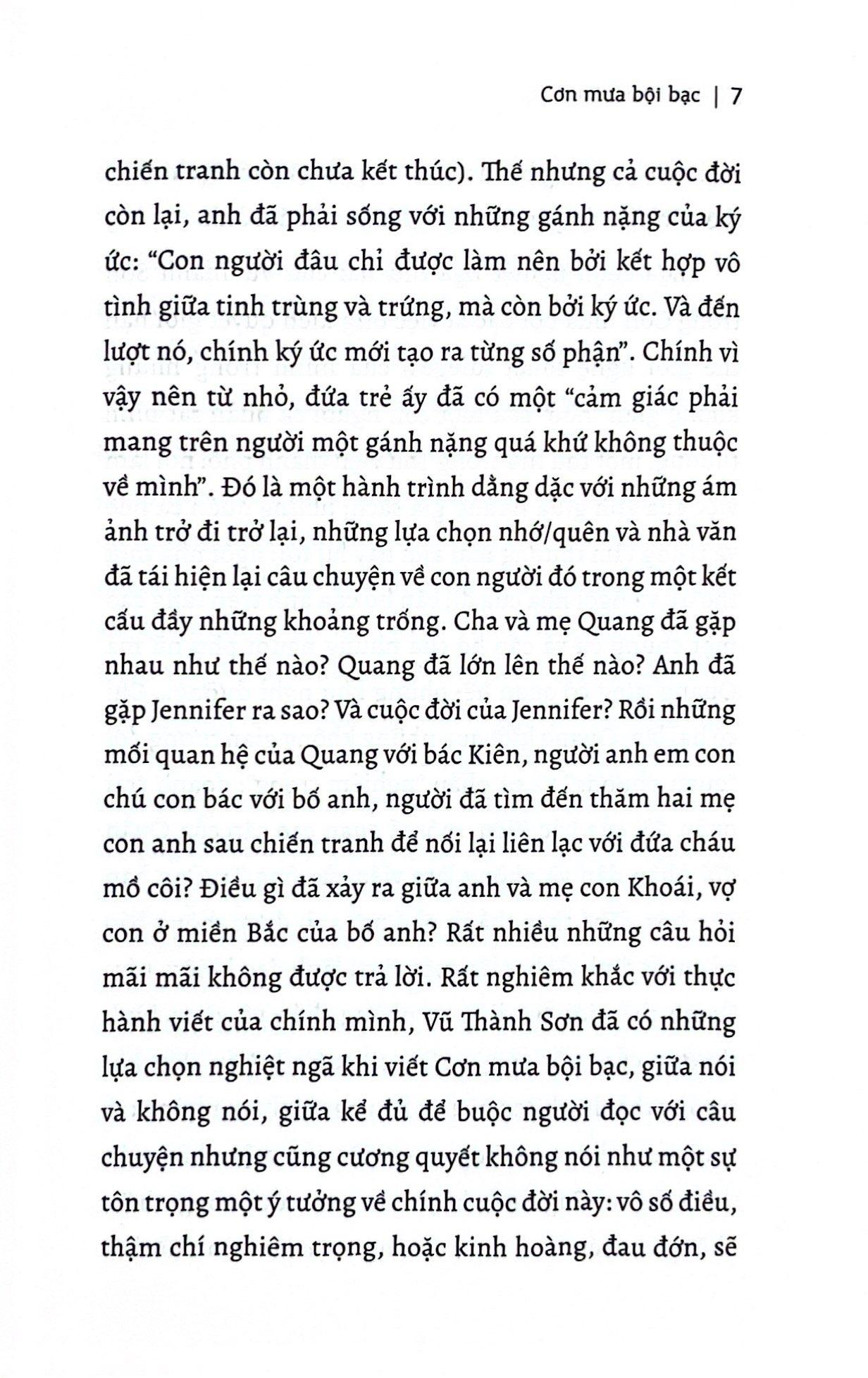 Công việc của nhà văn không phải là tìm kiếm sự thật bởi vì đó là công việc của sử gia, cũng không phải là ghi chép lại câu chuyện một cách trung thành để khỏi bị lãng quên, mà là đem đến cho câu chuyện một gương mặt, một số phận. Lịch sử đang cô đơn hơn lúc nào hết. Công việc của một nhà văn là làm mới lịch sử, cho nó một gương mặt của con người”. Đó là suy nghĩ của Jennifer, nhân vật trong Cơn mưa bội bạc về công việc của m.ình. Và có lẽ, đó cũng chính là xác tín về văn chương của Vũ Thành Sơn, một người viết có ý thức sâu sắc về nghề. Ý thức đó đã hiện hữu trong những gì ông đã viết, đã in, từ những tập truyện ngắn Em có hay trời buồn trời chuyển mưa đó không?; Hà mã, chó, chim, cá và những chuyện khác; tiểu thuyết Căn nhà giữa những đám mây và đến tiểu thuyết mới này của ông, Cơn mưa bội bạc, ý thức và xác tín ấy càng trở nên đông đặc và vững chắc.