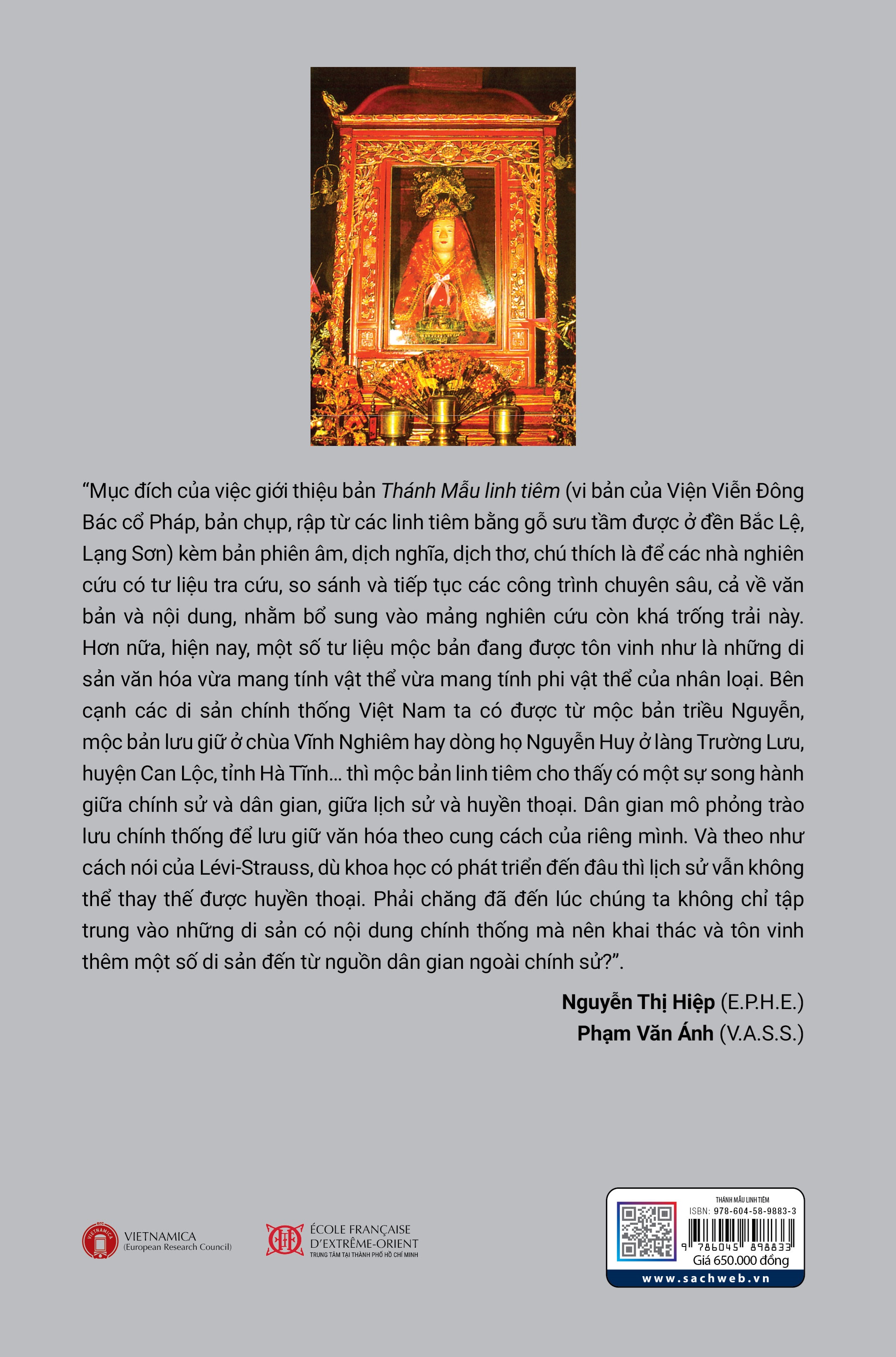 "Mục đích của việc giới thiệu bản "Thánh Mẫu Linh Tiêm" (vi bản của Viện Viễn Đông Bác cổ Pháp, bản chụp, rập từ các linh tiêm bằng gỗ sưu tầm được ở đền bắc Lệ, Lạng Sơn) kèm bản phiên âm, dịch nghĩa, dịch thơ, chú thích là để các nhà nghiên cứu có tư liệu tra cứu, so sánh và tiếp tục các công trình chuyên sâu, cả về văn bản và nội dung, nhằm bổ sung vào bảng nghiên cứu còn khá trống trải này.