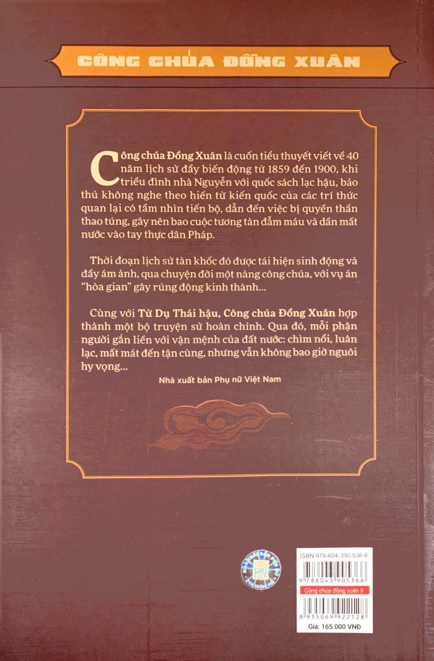 Công chúa Đồng Xuân có thể được xem là phần tiếp theo của Từ Dụ thái hậu, cùng với Từ Dụ thái hậu hợp thành bộ tiểu thuyết lịch sử đầy đủ về triều Nguyễn. Nếu Từ Dụ thái hậu là thời thịnh Nguyễn (trải 30 năm, từ Gia Long đầu triều đến đầu thời Tự Đức), thì Công chúa Đồng Xuân tái hiện khoảng 40 năm đầy biến động tang thương trải từ năm 1859 đến năm 1900. Đây là 1 cuốn tiểu thuyết đồ sộ 66 chương với hàng trăm nhân vật, đa phần là các nhân vật có thật trong lịch sử. Nhân vật Từ Dụ có cuộc đời trải dài suốt triều Nguyễn, trong Công chúa Đồng Xuân vẫn là một nhân vật mang tính “nền tảng”. Khác với Từ Dụ thái hậu đặc tả chuyện “cung đấu”, chuyện quân thần thời thịnh trị; Công chúa Đồng Xuân theo dòng lịch sử kể lại những chính biến kinh hoàng, với xương sống là việc thực dân Pháp dần chiếm nước ta, biến nước ta thành 1 nước bị đô hộ, triều đình nhà Nguyễn mất dần quyền lực và trở thành con rối trong tay quyền thần, Pháp súy. Khá rõ ràng và kiên quyết, không ít đau tiếc ngậm ngùi, tiểu thuyết đưa ra quan điểm của tác giả về một sự “lỡ vận” của đất nước, khi quốc sách sai lầm, triều đình do dự quá lâu ko nghe theo hiến từ kiến quốc của các trí thức quan lại có tầm nhìn tiến bộ (về việc canh tân đất nước, củng cố quốc phòng, mở rộng giao thương, hòa hoãn để hạn chế thương vong chiến ). Quốc sách cố chấp và bạc nhược đã khiến các vua Nguyễn dần đi vào ngõ cụt, cắt đất dâng dần cho Pháp, chịu nhiều chiến phí; nhiều cuộc nổi loạn và binh biến diễn ra liên miên, đặc biệt là xung đột với dân Đạo, làm rối ren và suy kiệt đất nước. Có thể nói qua tiểu thuyết Công chúa Đồng Xuân, người đọc có dịp nhìn lại đầy đủ và thấu đáo sử Việt thời đầu Pháp thuộc, từ đó nhìn thời hiện đại một cách “biện chứng” hơn.