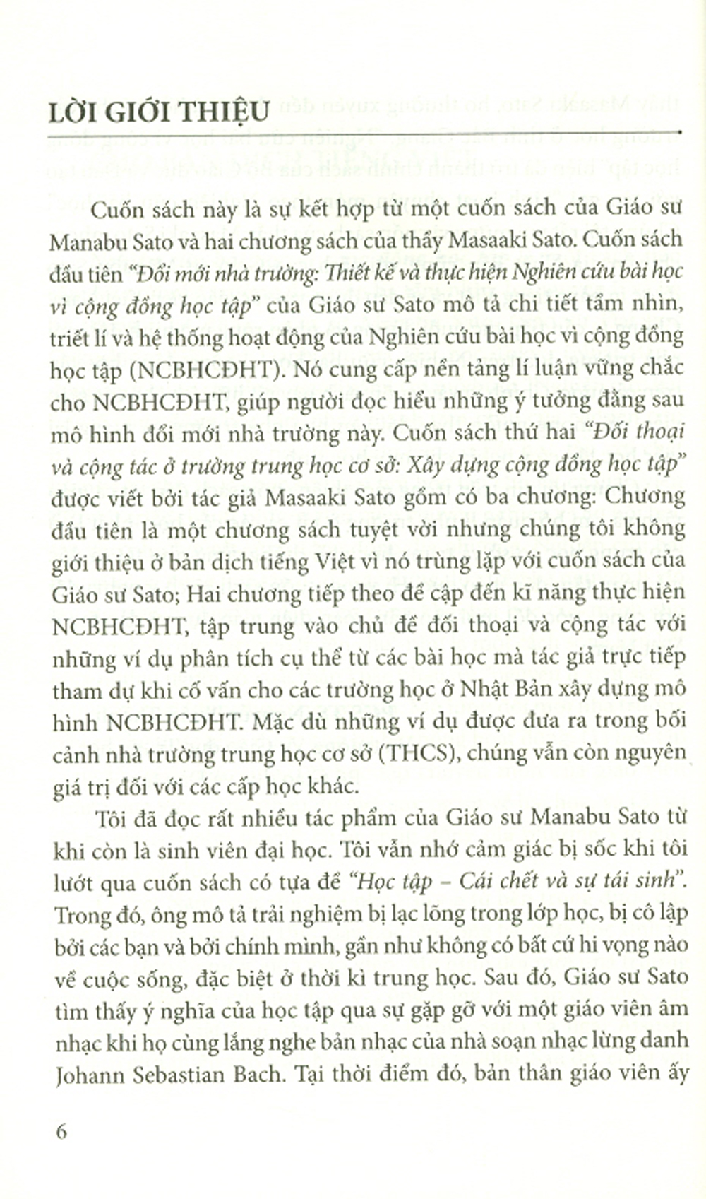 Cuốn sách này là sự kết hợp từ một cuốn sách của Giáo sư Manabu Sato và hai chương sách của thầy Masaaki Sato. Cuốn sách đầu tiên “Đổi mới nhà trường: Thiết kế và thực hiện Nghiên cứu bài học vì cộng đồng học tập” của Giáo sư Sato mô tả chi tiết tầm nhìn, triết lí và hệ thống hoạt động của Nghiên cứu bài học vì cộng đồng học tập (NCBHCĐHT). Nó cung cấp nền tảng lí luận vững chắc cho NCBHCĐHT, giúp người đọc hiểu những ý tưởng đằng sau mô hình đổi mới nhà trường này. Cuốn sách thứ hai “Đối thoại và cộng tác ở trường trung học cơ sở: Xây dựng cộng đồng học tập” được viết bởi tác giả Masaaki Sato gồm có ba chương: Chương đầu tiên là một chương sách tuyệt vời nhưng chúng tôi không giới thiệu ở bản dịch tiếng Việt vì nó trùng lặp với cuốn sách của Giáo sư Sato; Hai chương tiếp theo để cập đến kĩ năng thực hiện NCBHCĐHT, tập trung vào chủ đề đối thoại và cộng tác với những ví dụ phân tích cụ thể từ các bài học mà tác giả trực tiếp tham dự khi cố vấn cho các trường học ở Nhật Bản xây dựng mộ hình NCBHCĐHT. Mặc dù những ví dụ được đưa ra trong bối cảnh nhà trường trung học cơ sở (THCS), chúng vẫn còn nguyên giá trị đối với các cấp học khác.