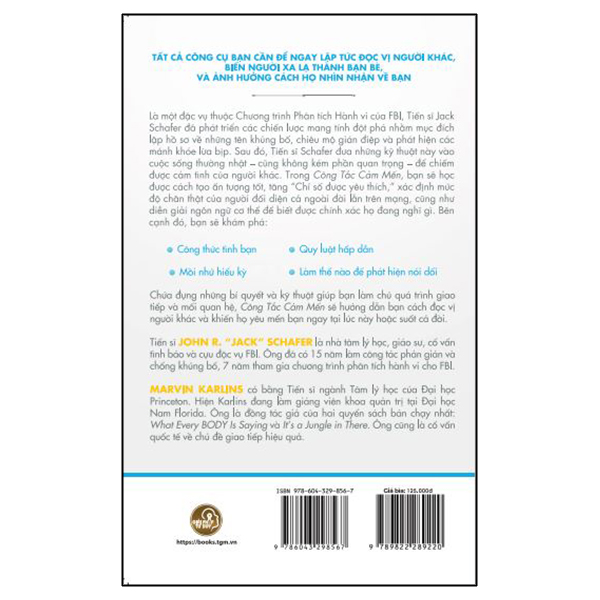 “Chất lượng cuộc sống là chất lượng của những mối quan hệ ta có.” – Tony Robbins Hãy tưởng tượng rằng, cuộc sống sẽ thay đổi thế nào nếu bạn có khả năng biến một người xa lạ thành bạn bè ngay trong lần gặp đầu tiên? Một công việc tốt, một dự án kinh doanh khởi sắc hay một mối quan hệ tình cảm chất lượng sẽ không còn xa vời nữa. Vì giờ đây, bạn có thể mở rộng vòng tròn quan hệ của mình bất cứ lúc nào. Từ cựu đặc vụ FBI chuyên phân tích hành vi và tuyển dụng điệp viên, cuốn sách Công Tắc Cảm Mến tiết lộ những chiến lược đã được chứng minh qua thực tế về cách đọc vị người khác và khiến họ có thiện cảm với mình ngay lập tức. Dù đang trong một cuộc gọi bán hàng, ngày hẹn hò đầu tiên hay buổi phỏng vấn xin việc thì bạn cũng có thể dễ dàng làm được điều đó. Với 20 năm kinh nghiệm làm đặc vụ cho Chương Trình Phân Tích Hành Vi của Cục Điều Tra Liên Bang Mỹ FBI, Tiến sĩ Jack Schafer đã phát triển các chiến lược mang tính đột phá nhằm mục đích lập hồ sơ về những tên khủng bố, chiêu mộ gián điệp và phát hiện các mánh khóe lừa bịp. Hiện tại, những kỹ thuật này được đem áp dụng và kiểm chứng trong nhiều tình huống quan trọng của đời sống thường nhật để giúp bạn chiếm được tình cảm của người khác. Trong Công Tắc Cảm Mến, bạn sẽ học được cách tạo ấn tượng tốt, tăng “Chỉ số được yêu thích”(Likeability Quotient), xác định mức độ chân thật của người đối diện cả ngoài đời lẫn trên mạng, diễn giải ngôn ngữ cơ thể để biết được chính xác họ đang nghĩ gì, nắm vững các tín hiệu phi ngôn ngữ ảnh hưởng đến cách mọi người nhận thức bạn và tăng hoặc giảm cường độ của một mối quan hệ. Bên cạnh đó, bạn sẽ khám phá: Công thức tình bạn Quy luật hấp dẫn Mồi nhử hiếu kỳ Làm thế nào để phát hiện nói dối Có thể nói rằng, Công Tắc Cảm Mến chứa đựng tất cả bí quyết và kỹ thuật cần thiết cho một người làm chủ quá trình giao tiếp cũng như các mối quan hệ. Vì thế, sở hữu quyển sách này chính là nắm trong tay một công cụ vô cùng đắc lực để đọc vị người khác và khiến họ yêu mến bạn trong chốc lát hoặc cả đời. *Công Tắc Cảm Mến nhận được gần 5.000 lượt đánh giá trên Goodreads và 1000 lượt đánh giá trên Amazon (75% độc giả đánh giá 5 sao), TGM Books rất mong cuốn sách sẽ mang lại điều hữu ích cho bạn. TÁC GIẢ John R. “Jack” Schafer Tiến sĩ John R. “Jack” Schafer là một nhà tâm lý, giáo sư, chuyên viên tư vấn tình báo và cựu đặc vụ FBI. Tiến sĩ Schafer đã có 15 năm hoạt động trong lĩnh vực điều tra chống tình báo và chống khủng bố, cũng như 7 năm làm chuyên gia phân tích hành vi cho Chương trình Phân tích Hành vi thuộc Bộ phận Bảo an Quốc gia của FBI. Ông xây dựng các phương pháp chiêu mộ gián điệp, thẩm vấn kẻ khủng bố và đào tạo điệp viên về nghệ thuật thuyết phục và thẩm vấn. Tiến sĩ Schafer viết bài cho tạp chí tâm lý online nổi tiếng Psychology Today, là tác giả và đồng tác giả của 6 quyển sách và vô số bài báo trên các tạp chí chuyên ngành và phổ biến. Ông là giáo sư Khoa Chấp Pháp và Tư Pháp Hình Sự tại Đại học Western Illinois. Marvin Karlins Marvin Karlins nhận bằng Tiến sĩ Tâm lý học tại Đại học Princeton và hiện là Giáo sư môn Quản trị tại Khoa Quản trị Kinh doanh của Đại học South Florida. Tiến sĩ Karlins là tư vấn viên quốc tế chuyên về các vấn đề tương tác cá nhân hiệu quả, đồng thời là tác giả của 24 quyển sách, bao gồm hai tác phẩm bán chạy trong nước, What Every BODY Is Saying và It’s a Jungle in There. Ông sống tại Riverview, bang Florida, cùng với vợ Edyth và con gái Amber .
