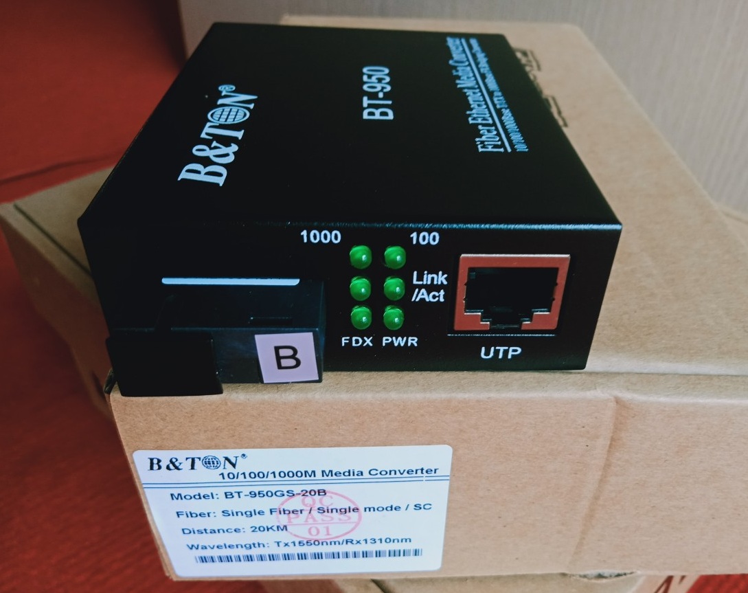 Chuyển đổi quang điện 1 sợi 10/100/1000M, hãng B&TON, Single mode - Model: BT-950GS-25B ( đầu B) - Loại1 sợi cho 10/100/1000M - Chuẩn kết nối SC, Single mdoe - Đường truyển 20km. - Bước