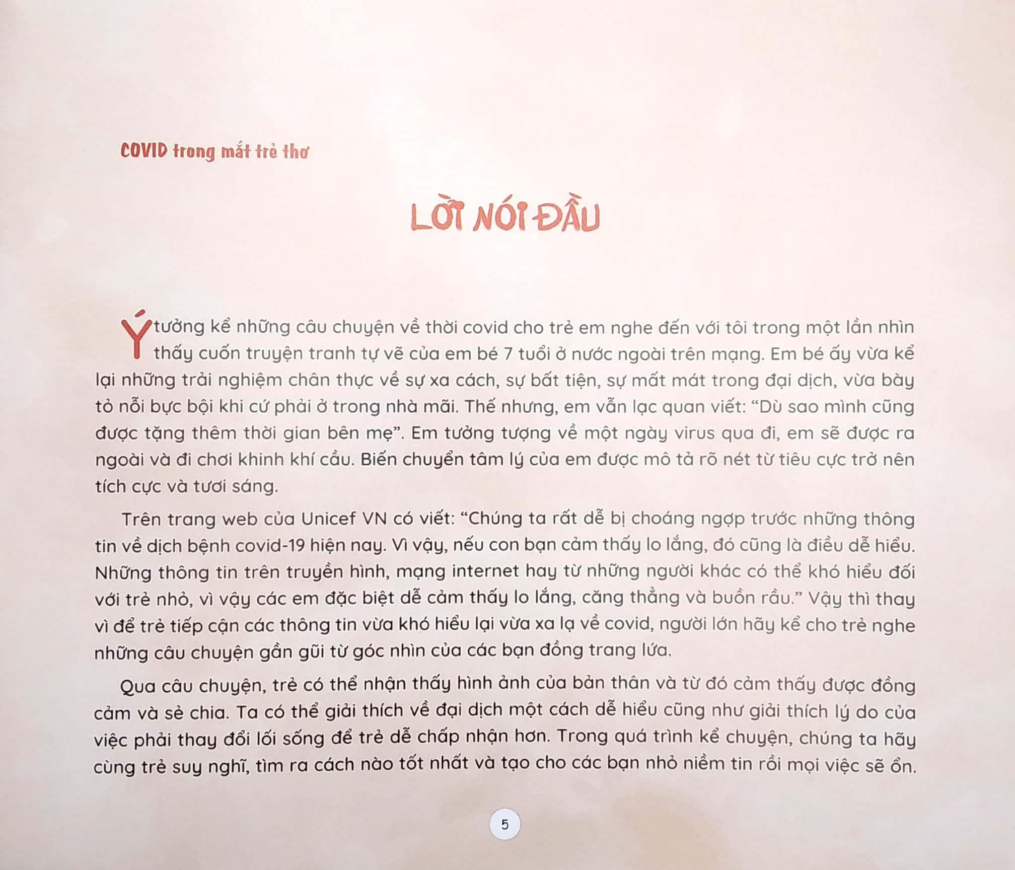 “Covid trong mắt trẻ thơ” là tập hợp 7 truyện tranh song ngữ Việt – Anh khắc họa cuộc sống trong thời đại dịch qua góc nhìn của trẻ em, không chỉ người lớn mà cuộc sống của trẻ cũng xảy ra nhiều thay đổi trong suốt thời gian dịch và đặc biệt là trẻ cần sự quan tâm và sẻ chia nhiều hơn từ mọi người.