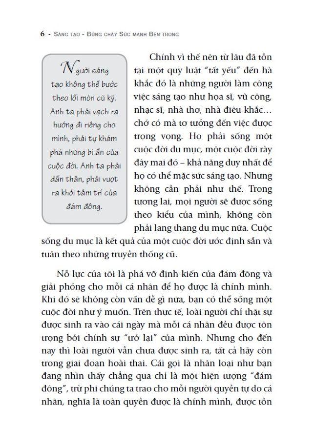 Người sáng tạo không thể bước theo lối mòn cũ kỹ. Anh ta phải vạch ra hướng đi riêng cho m.ình, phải tự khám phá những bí ẩn của cuộc đời. Anh ta phải dấn thân, phải vượt ra khỏi tâm trí của đám đông. Tâm lý đám đông cũng có sức cám dỗ của riêng nó: những ai một mực cho rằng lựa chọn của đám đông là hướng đúng đắn duy nhất thì sẽ được tôn trọng, kính nể.