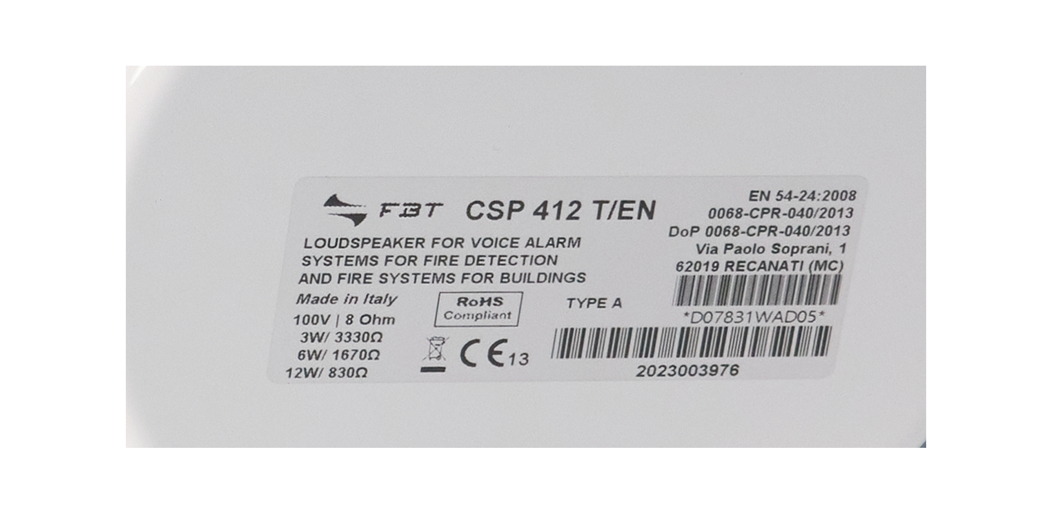 Bộ CSP 406 T/EN và CSP 412 T/EN, thích hợp để gắn trên trần giả, đảm bảo khả năng tái tạo xuất sắc cả giọng nói và âm nhạc. Được làm bằng tấm kim loại dập nổi được xử lý bằng sơn trắng chống xước và không phản chiếu, chúng sẽ phù hợp một cách trang nhã với mọi môi trường. Mỗi bộ phận bao gồm một vòng chịu lực với các móc lắp nhanh bằng lò xo để dễ dàng cố định vào trần nhà. Mặt nạ trung tâm với loa được nối với biến áp đường dây vừa với vòng bằng chuyển động xoay tiện dụng. Theo thông số kỹ thuật của hệ thống sơ tán bằng giọng nói EN 54-24, dòng loa này có nắp chống cháy bằng thép mạ kẽm kép, kết hợp với các dải đầu vào/đầu ra bằng gốm, cầu chì nhiệt và đầu tiếp đất. Máy biến áp tích hợp cho phép kết nối với các đường dây điện áp không đổi ở 100,