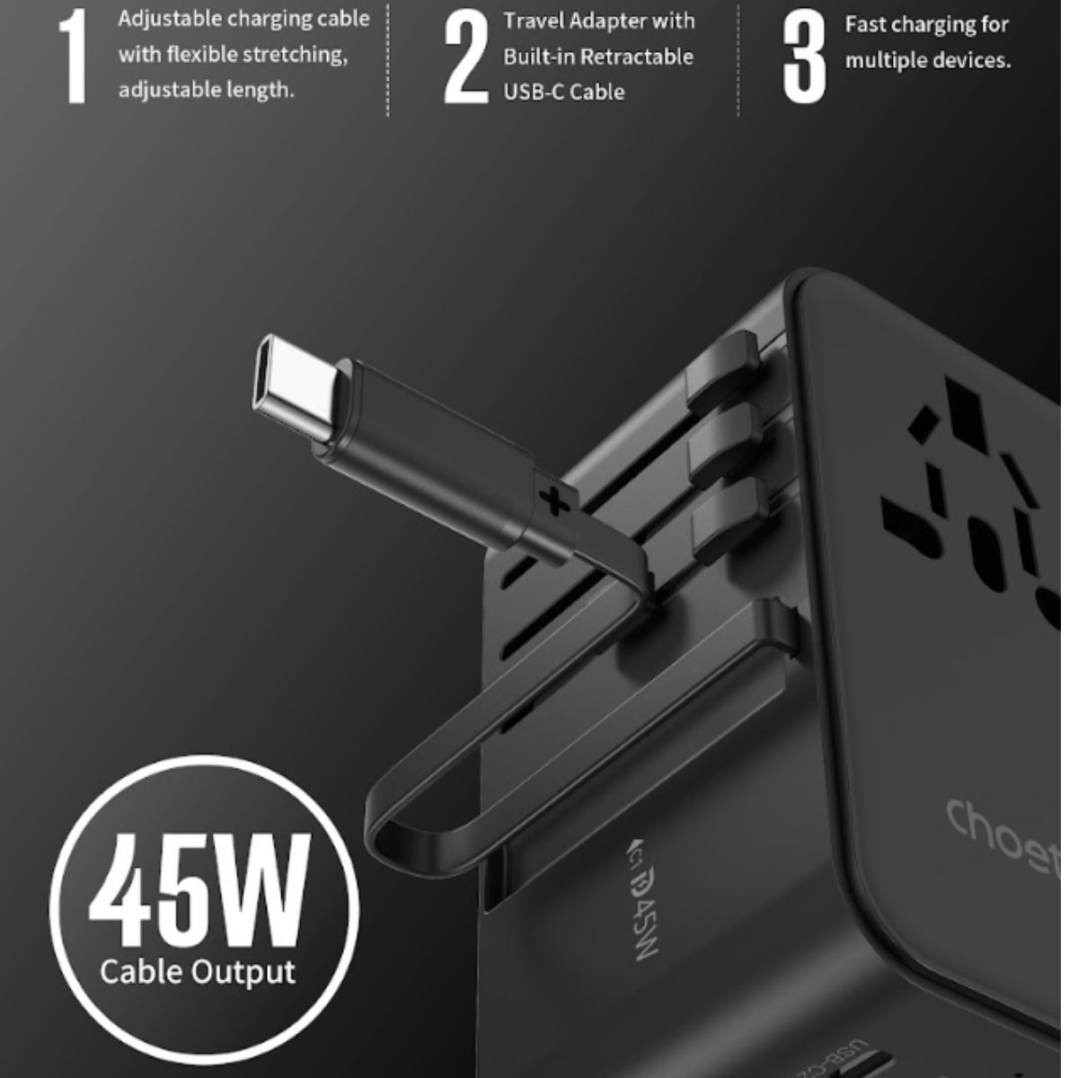 Củ sạc Choetech PD5020 du lịch đa năng tích hợp thêm dây cáp sạc Type C (35W)/ PD5021 (45W)/ PD5022 (70W)- Hàng chính hãng
